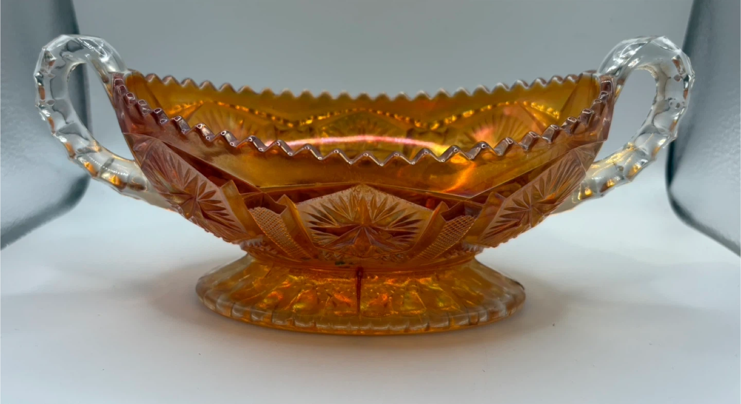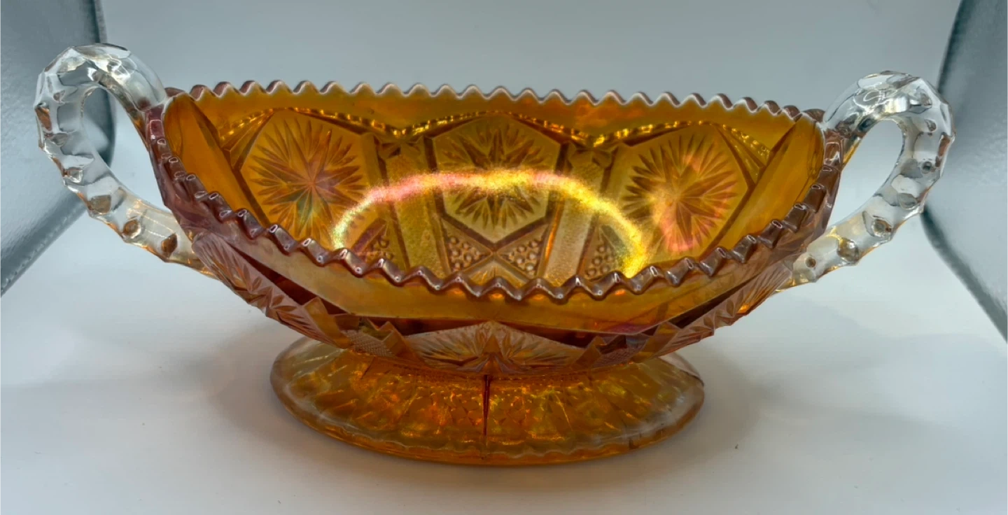 I'm selling a beautiful vintage carnival glass bowl! It features a stunning iridescent finish and two clear glass handles. This bowl would be a lovely addition to any collection or as a decorative piece in your home