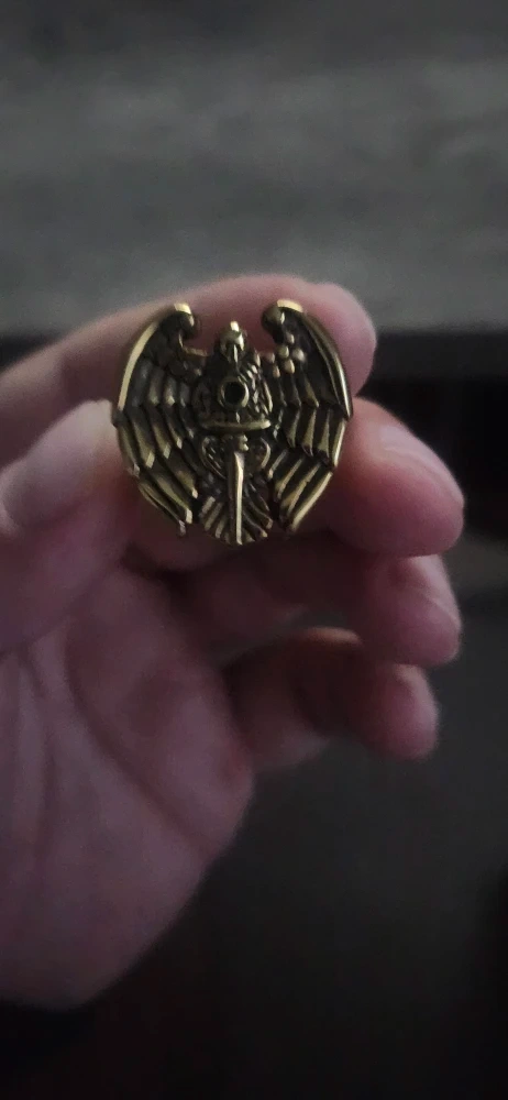 Selling a gold-toned ring with a unique design. It features an eagle with a sword, adding a touch of character. It's in great condition and ready to wear!