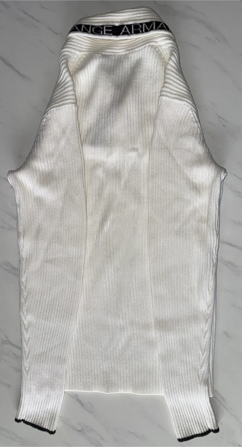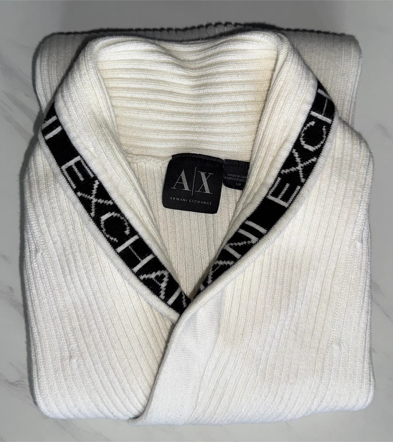 Selling a stylish Armani Exchange sweater! It's a cozy, ribbed knit in a clean white color. The collar features the Armani Exchange logo. Perfect for adding a touch of designer flair to your wardrobe!