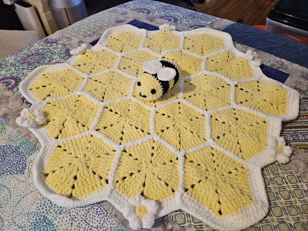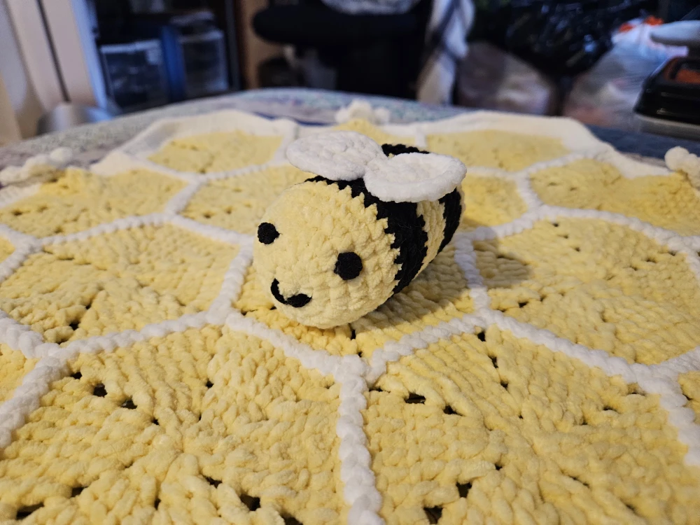 Crocheted with 100% Polyester yarn and stuffing. Eyes and mouth are embroidered onto the bee. Super soft and cute!