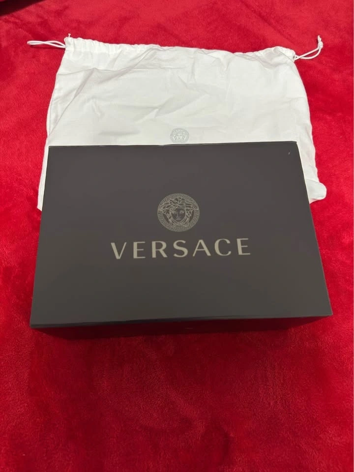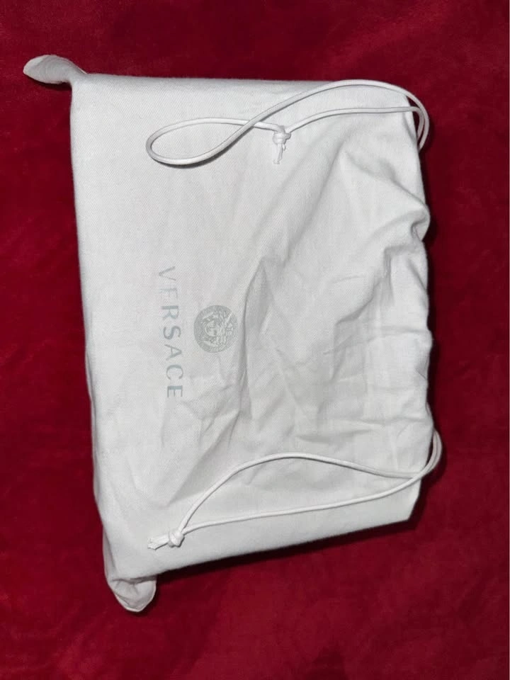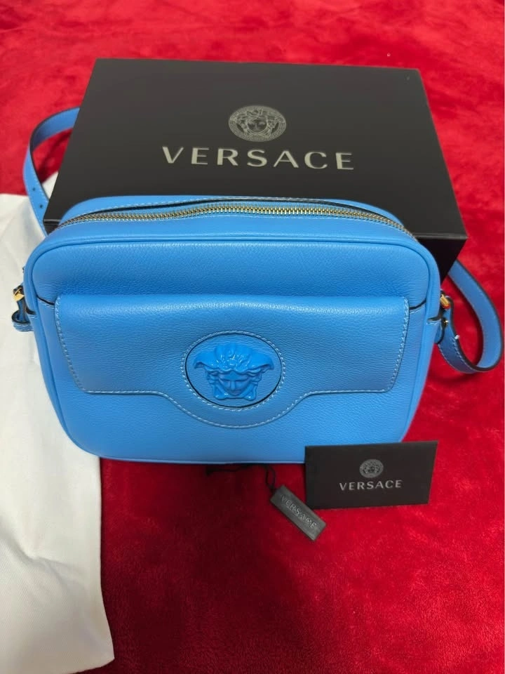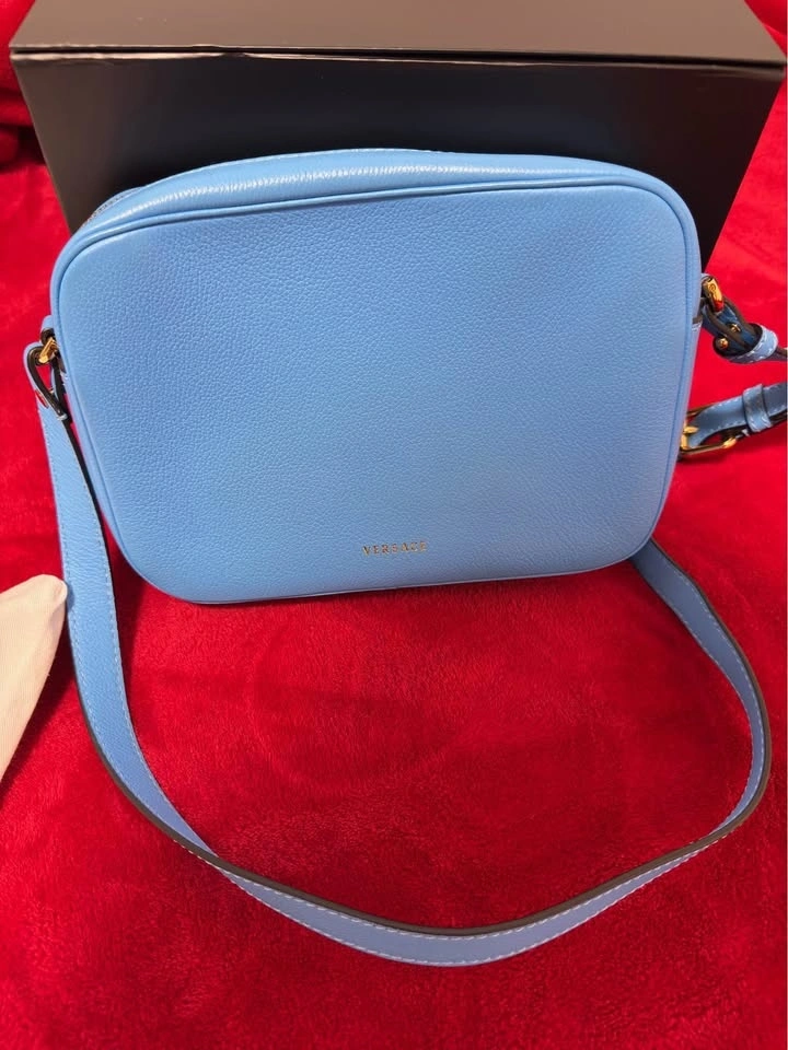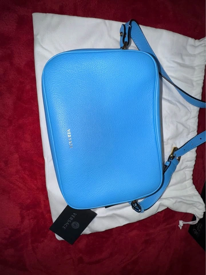 Versace luxury camera bag. Crafted from blue leather with adjustable straps, top zip closure, a front pocket with a flap, a flat internal pocket, and a Medusa plaque. Comes in original package with tags. Used only twice.