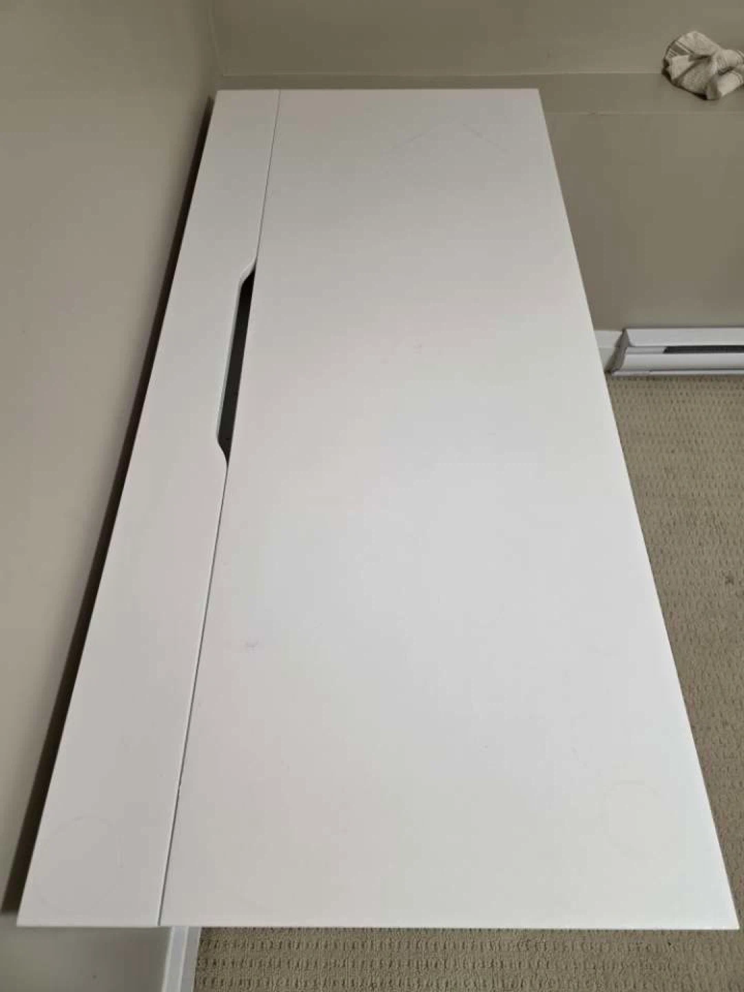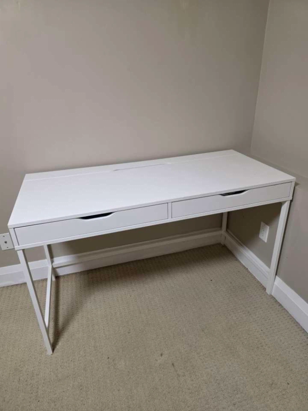 Selling a white desk that's perfect for a home office or study area. It has a clean and simple design, with drawers for storage. There is some stains / scratches on surface and in drawers.