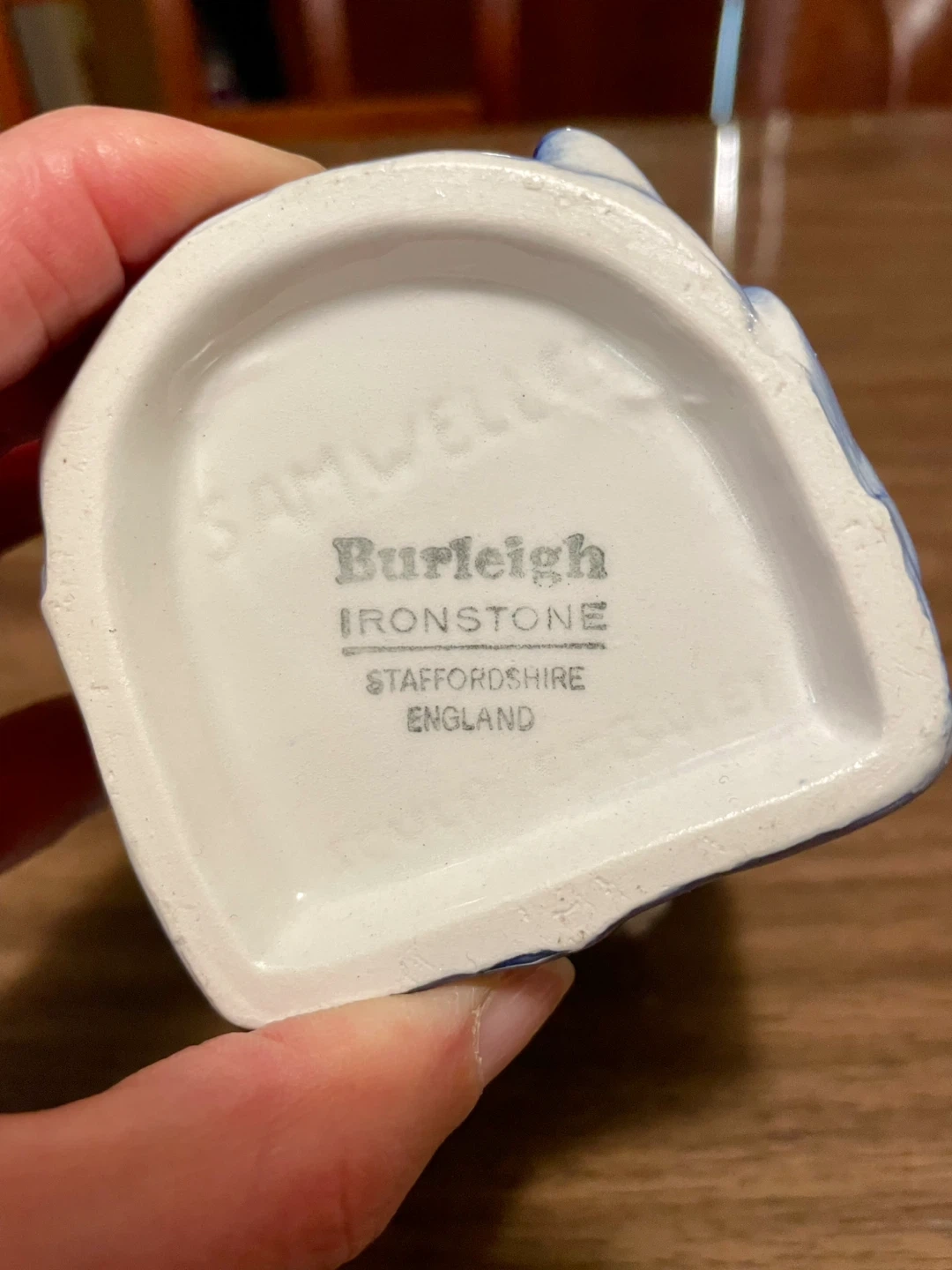 This rare Staffordshire blue and white Burleigh Ironstone Toby Jug creamer featuring the character Sam Weller from Charles Dickens' The Pickwick Papers is a vintage collectible produced by Burgess & Leigh.