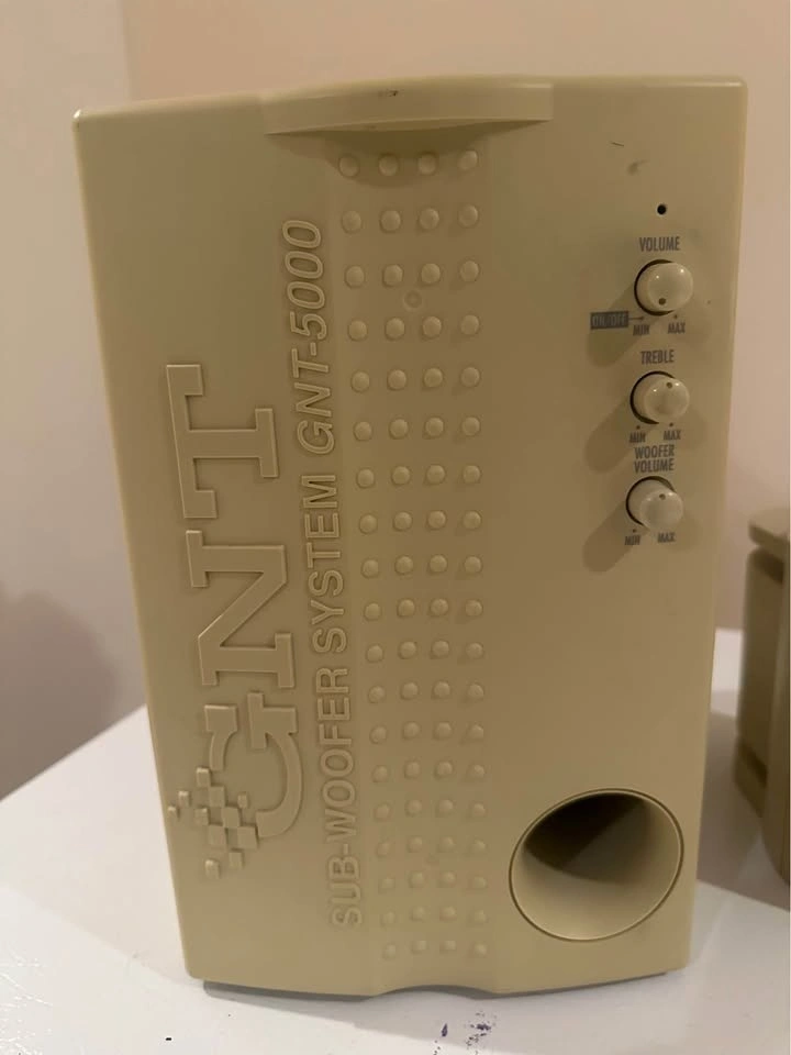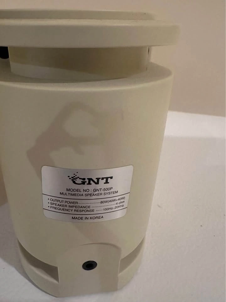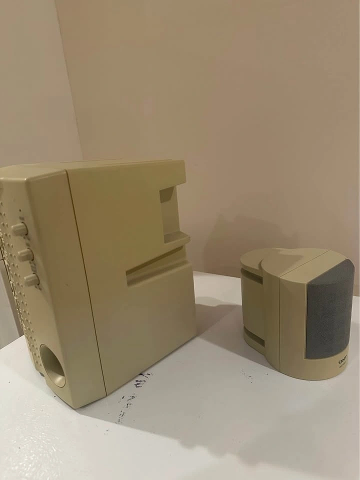 Vintage, wired, 2.1 multimedia subwoofer system from the 1990s, designed for home theater or computer use and made in Korea. It features a rectangular subwoofer and satellite speakers and provides deep bass for a nostalgic audio experience, though it is no longer in mainstream production.