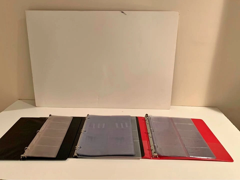 More than 40 2 row sleeves and 10 single row sleeves. Includes binders. Heavyweight polypropylene with a reinforced binding edge durable vinyl pages to hold your important business cards. Business card sheets / sleeves for organization. Includes binders $10