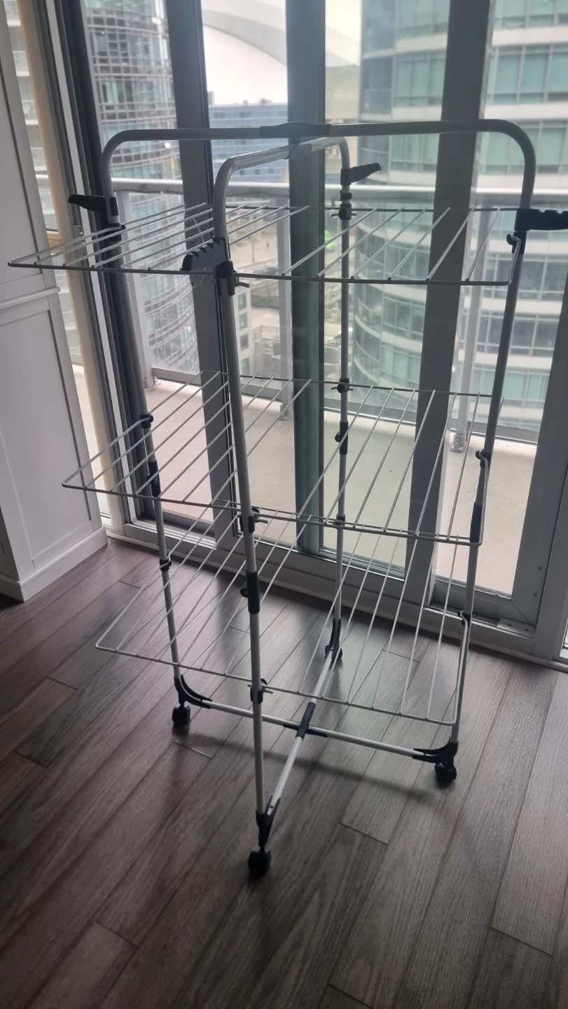 Selling a handy rolling clothes drying rack! It's perfect for small spaces and folds up for easy storage when not in use. Great for air-drying clothes, saving energy, and keeping your clothes in great shape