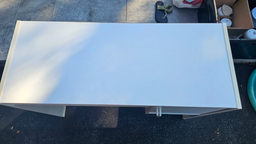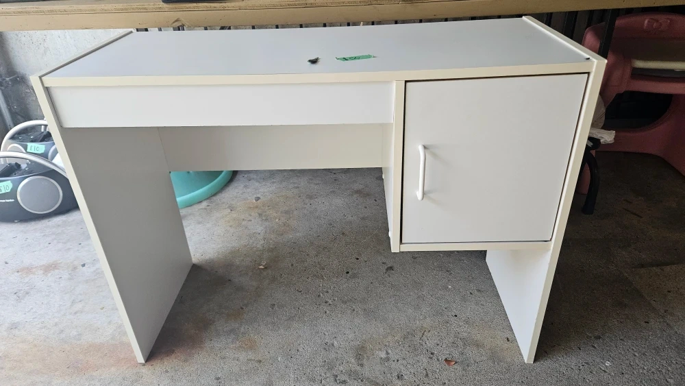 Selling a white desk with a drawer and cabinet for storage. It's in good condition and perfect for a home office or student. It has a clean look!