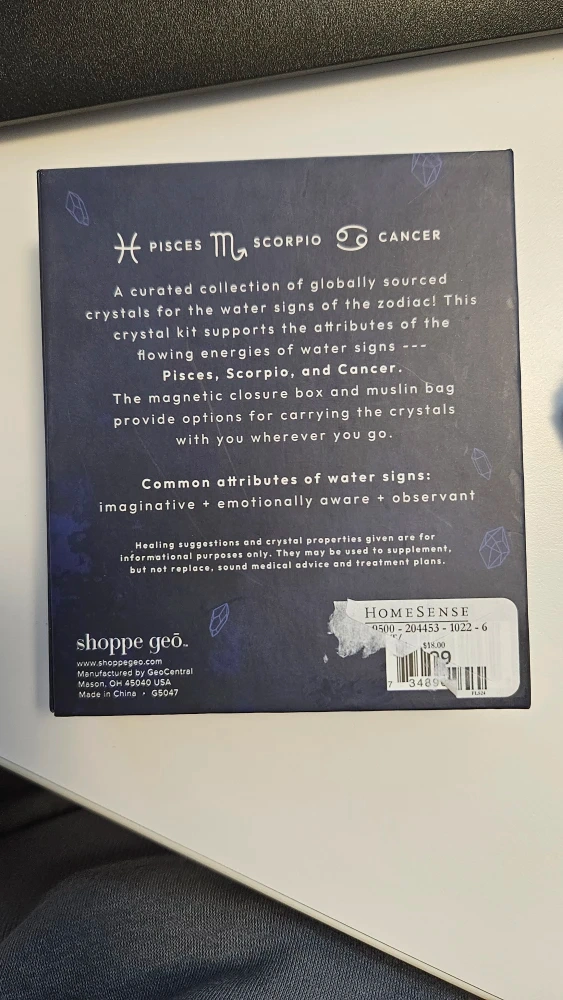 Selling a Zodiac crystal collection for the water signs: Pisces, Scorpio, and Cancer! This kit includes a curated collection of globally sourced crystals to support the attributes of these zodiac signs. The magnetic closure box and muslin bag provide options for carrying the crystals with you wherever you go. Crystals included are blue aventurine, lepidolite, aragonite, dalmatian jasper, black obsidian, and clear quartz.