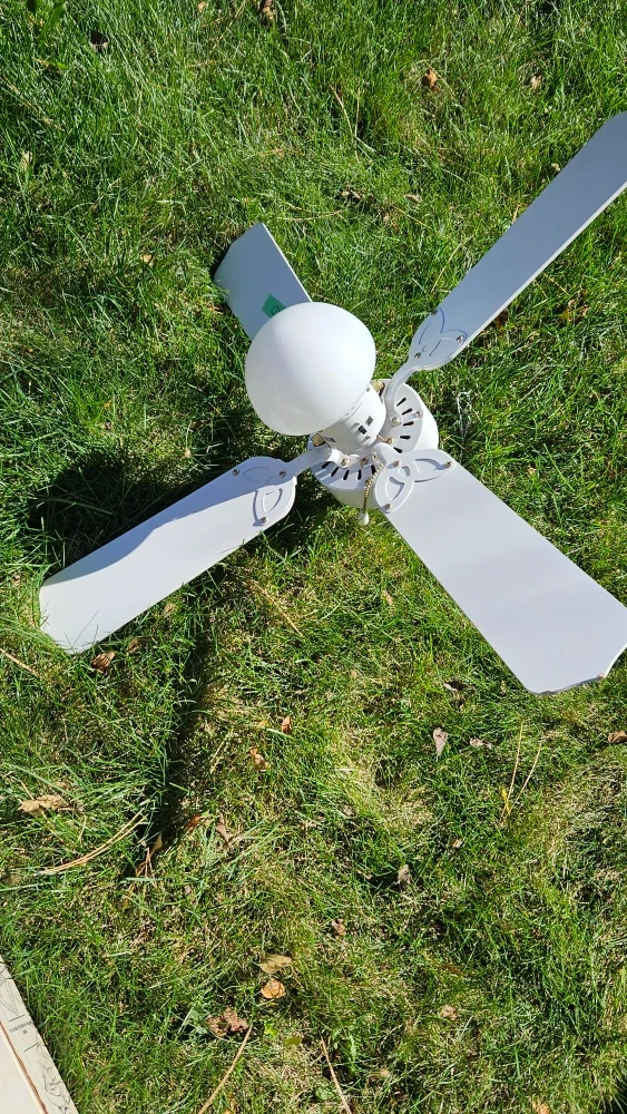 Selling a white ceiling fan. It has a classic design and would be a nice addition to any room. It's in good condition!