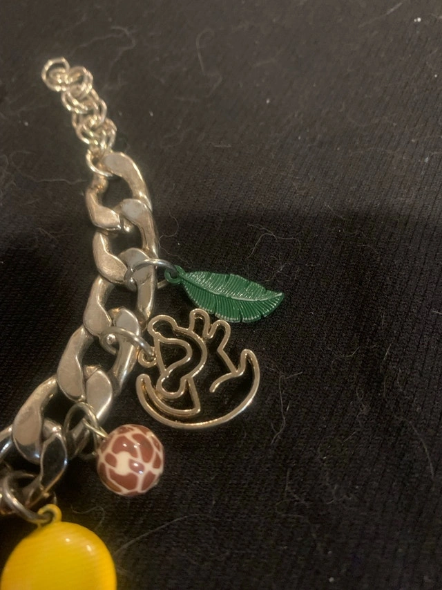 This is a deluxe Lion King themed charm bracelet with a gold chain and various Lion King themed charms. It's in good used condition, ready to add a touch of Disney magic to your outfit! A little polish should bring it right back to original condition! This bracelet has a unique style and showcases a variety of charms from the beloved movie. If the ad is up, it's still available. Get ready to show off your love for The Lion King!