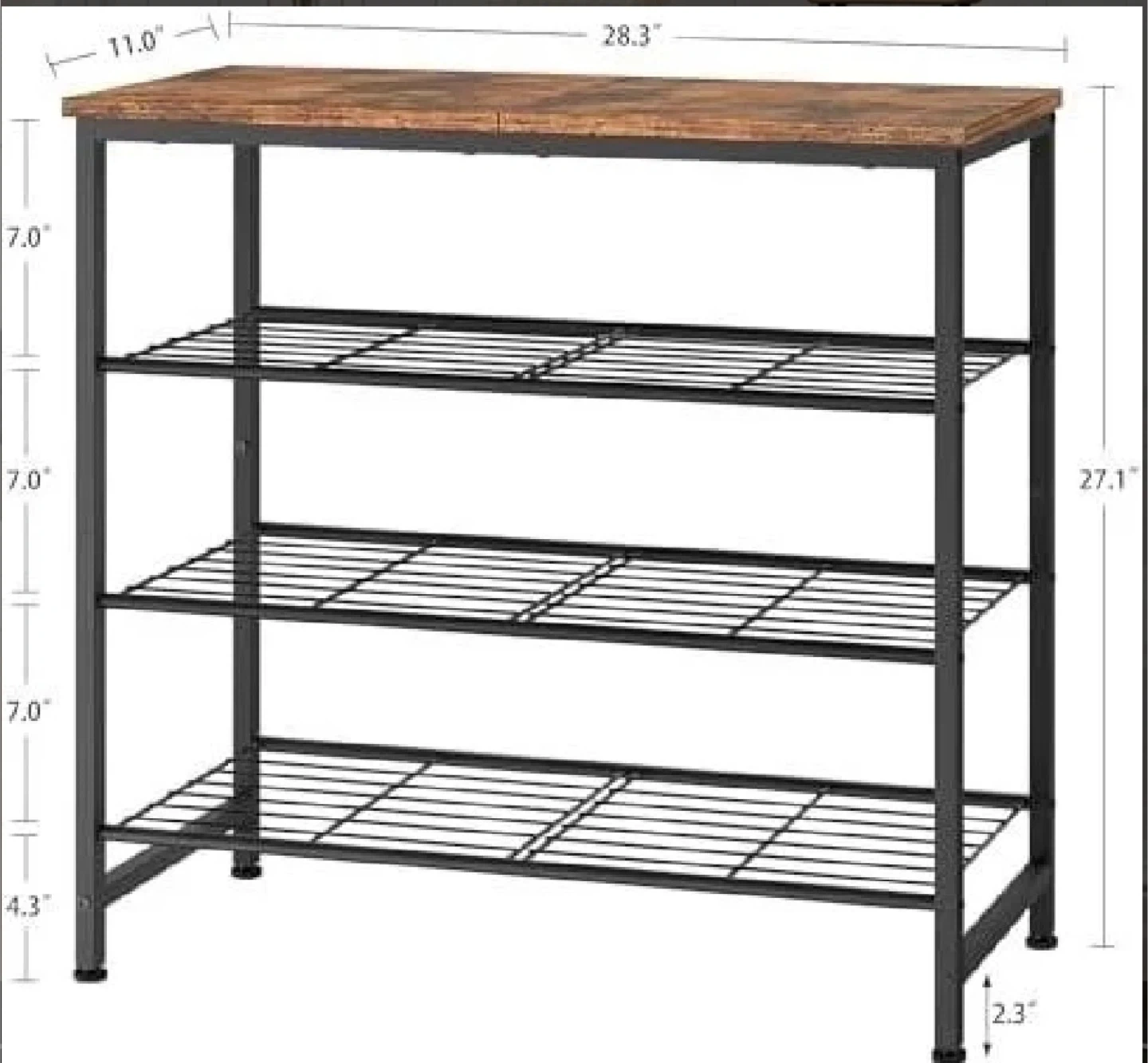I'm offering a brand new in box 4-tier industrial shoe rack, perfect for organizing your footwear with style. This sturdy rack features a wooden top and metal frame, providing a rustic yet modern look to any entryway or closet. It has a 4-tier design to store multiple pairs of shoes, or can be used for other decorative storage. Get organized and add a touch of industrial flair to your home with this shoe rack! Here are some specifications: