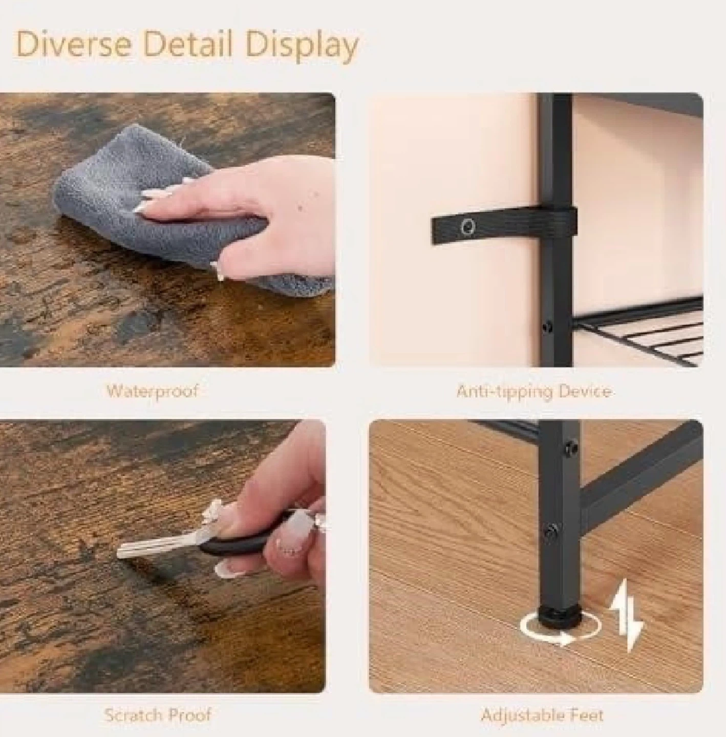 I'm offering a brand new in box 4-tier industrial shoe rack, perfect for organizing your footwear with style. This sturdy rack features a wooden top and metal frame, providing a rustic yet modern look to any entryway or closet. It has a 4-tier design to store multiple pairs of shoes, or can be used for other decorative storage. Get organized and add a touch of industrial flair to your home with this shoe rack! Here are some specifications: