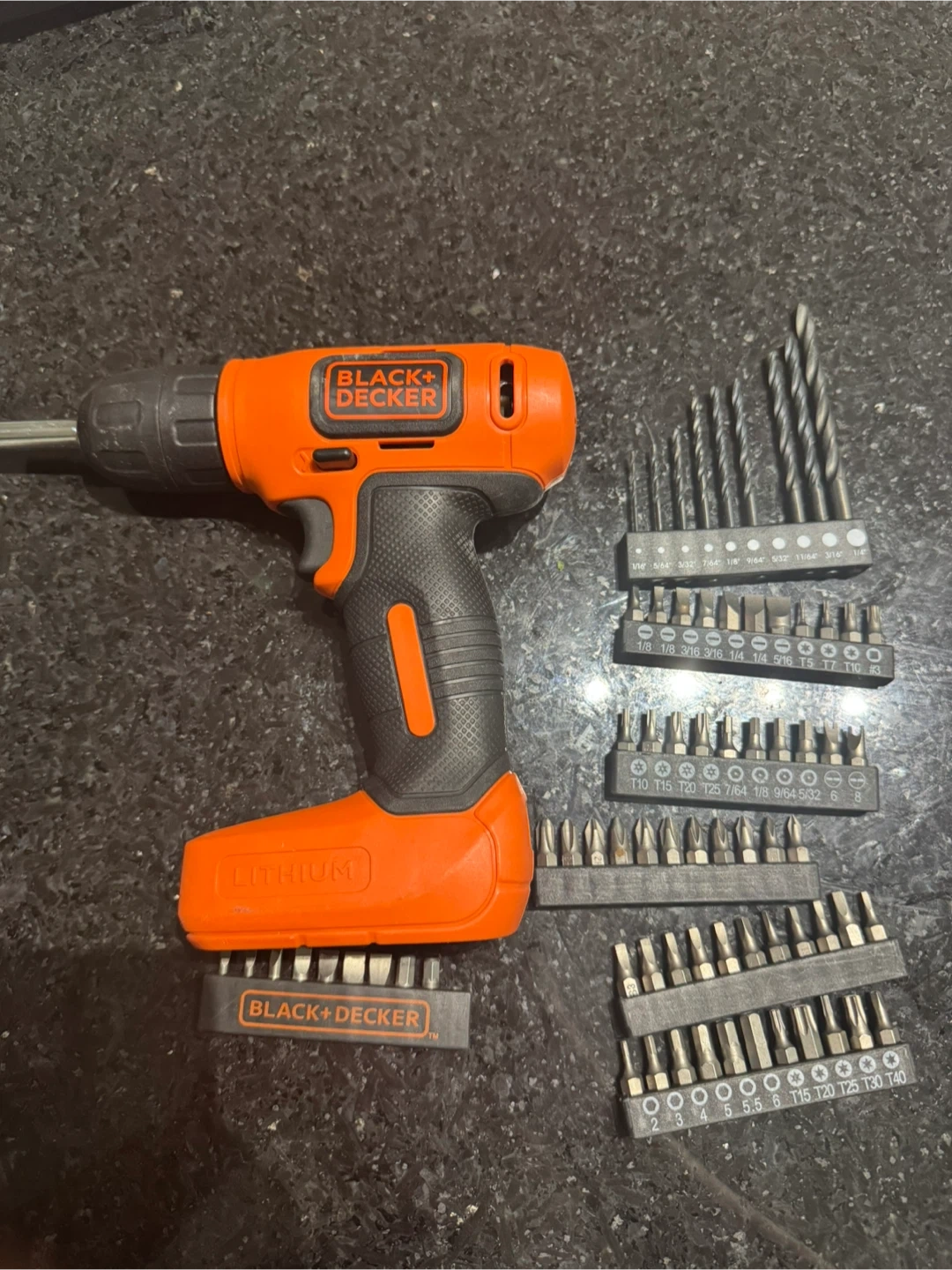 Orange and black Black+Decker cordless drill with a set of drill bits and driver bits. Includes various sizes for different tasks. Powered by Lithium.