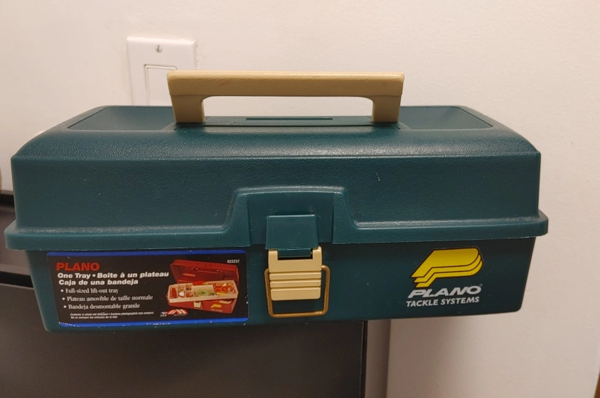 This box comes with a full-sized lift-out tray for organization. It's a dark green colour with a tan handle and latch. The box is made of durable plastic.