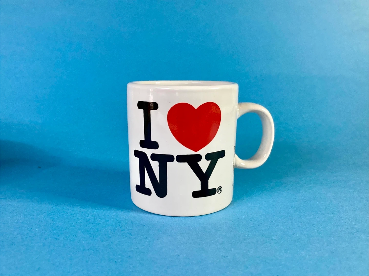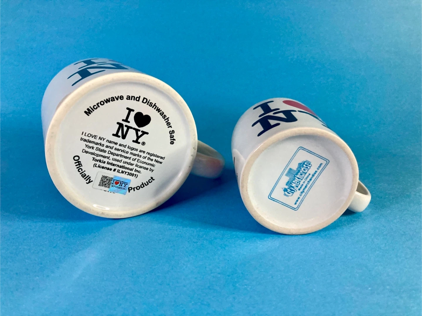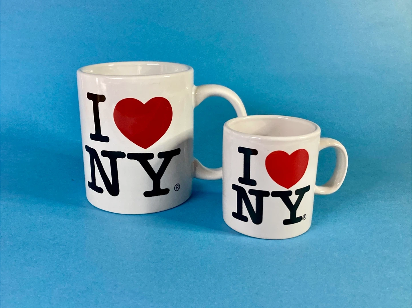 Pair of iconic "I ❤️ NY" coffee and espresso mugs, logo famously designed by Milton Glaser.