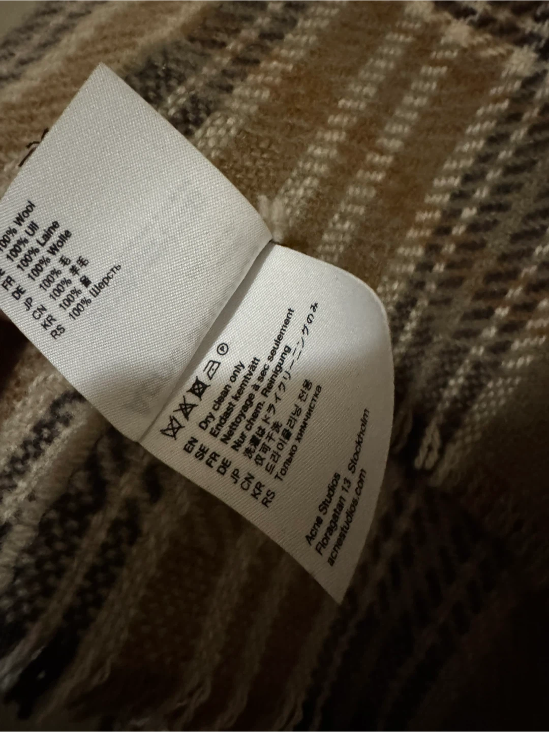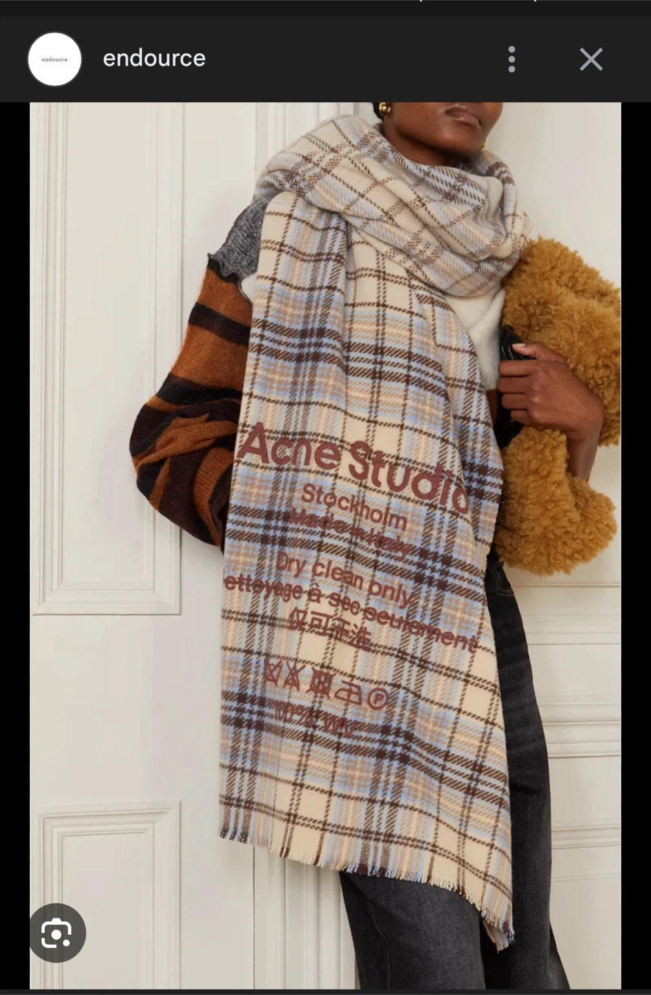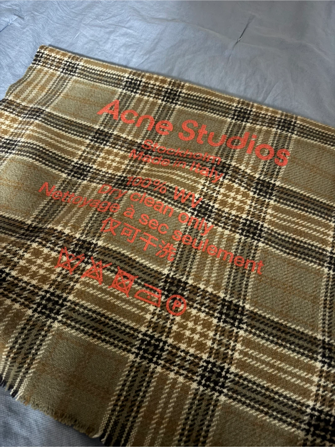 Cozy Acne Studios scarf in a lovely brown plaid pattern! It's made of 100% wool and measures 220 x 70 cm.