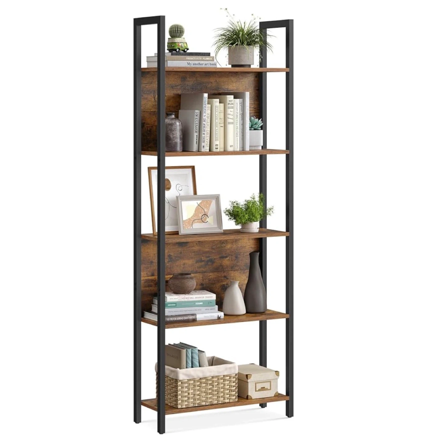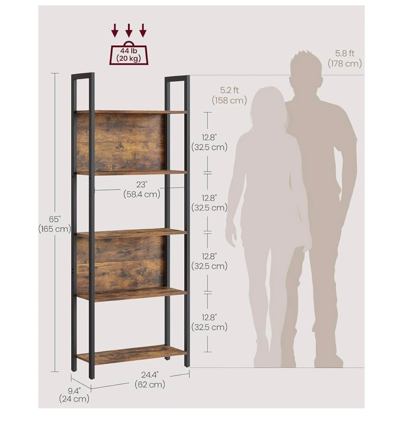 This VASAGLE bookshelf offers five open shelves for displaying your books and decor. It's made with a rustic brown wood finish and a sturdy black metal frame. Each shelf holds up to 44 lb (20 kg). This unit is 65" tall and 24.4" wide.