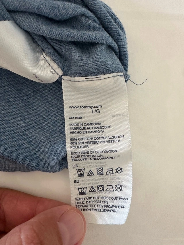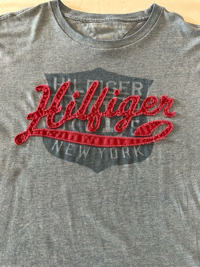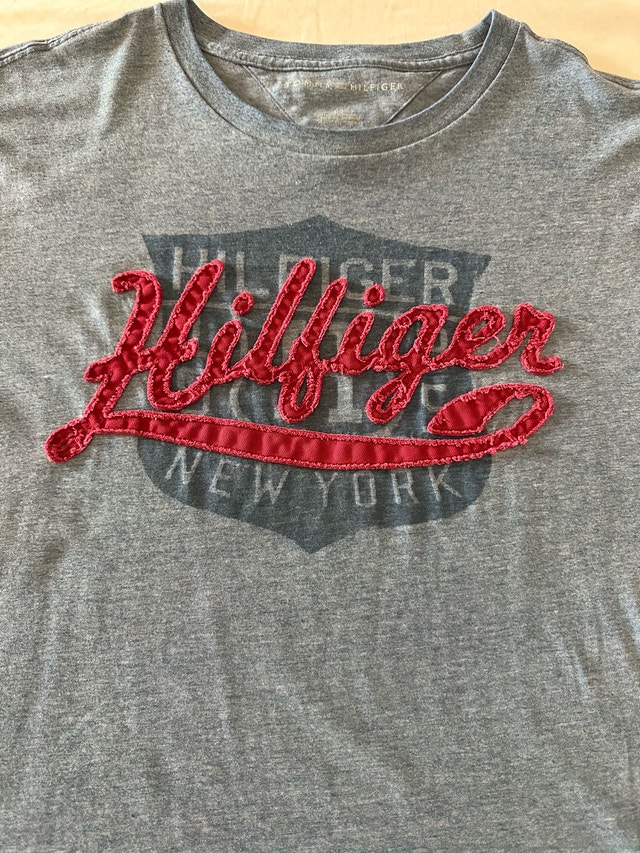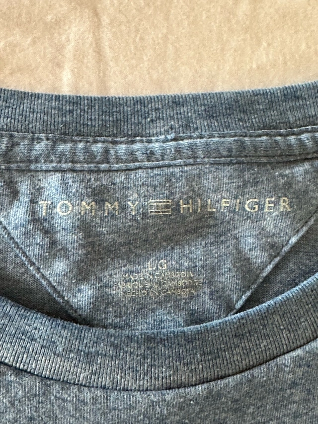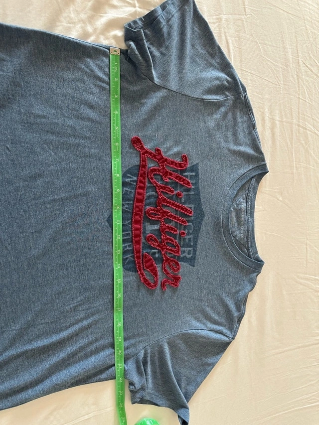 Check out this vintage Tommy Hilfiger t-shirt in a men's large size, featuring a unique embroidered logo. This shirt is made from a comfortable 60% cotton and 40% polyester blend, perfect for casual wear. Although it is a used item, it’s still in good condition and ready for a new home. Embrace the retro style with this classic tee! Here are some measurements: - Sleeve Length: 8.5 inches - Pit to pit: 22 inches - Shirt Length: 32 inches I'm pricing this at $35. If the ad is up, it's still available!