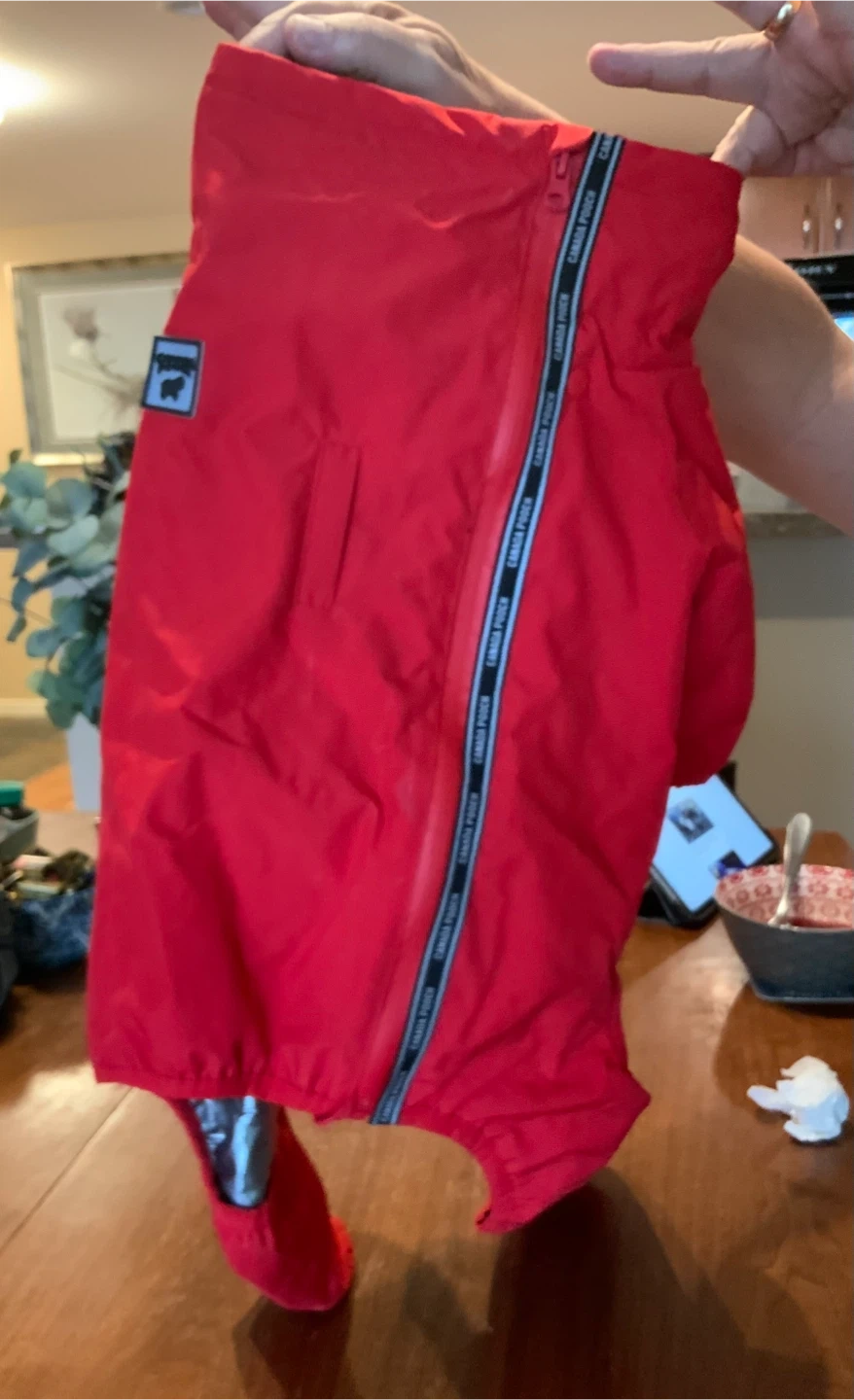 Warm red dog winter jacket from Canada Pooch. Features a zippered front for easy on and off. The outer shell is made of water-resistant material. This jacket is perfect for keeping your furry friend cozy during colder weather!