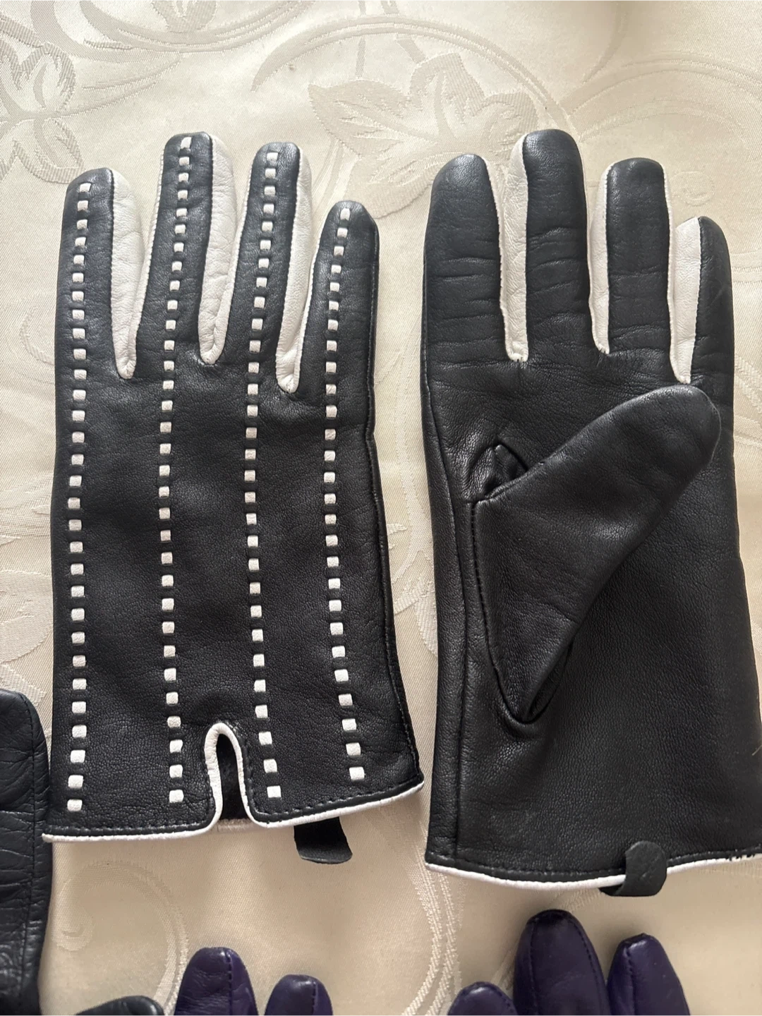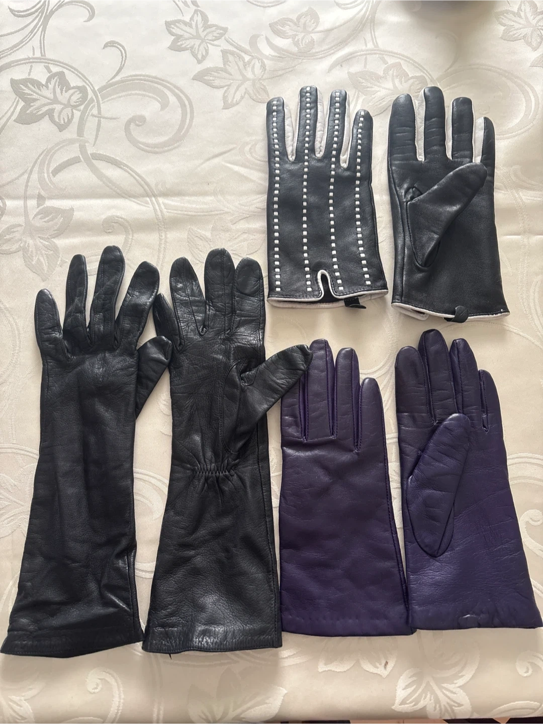 Collection of 3 pairs of leather gloves. Includes long black pair, one black pair with white stitching, and one pair of purple gloves. leather material.
