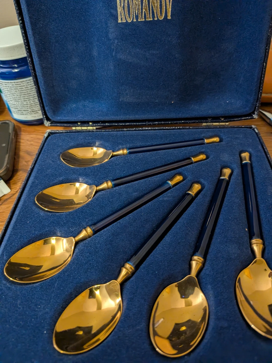 This is a set of five Romanov spoons. Each spoon has a gold-tone bowl and a dark blue handle with gold accents. They come in a blue velvet-lined case. These spoons would be lovely for serving dessert.