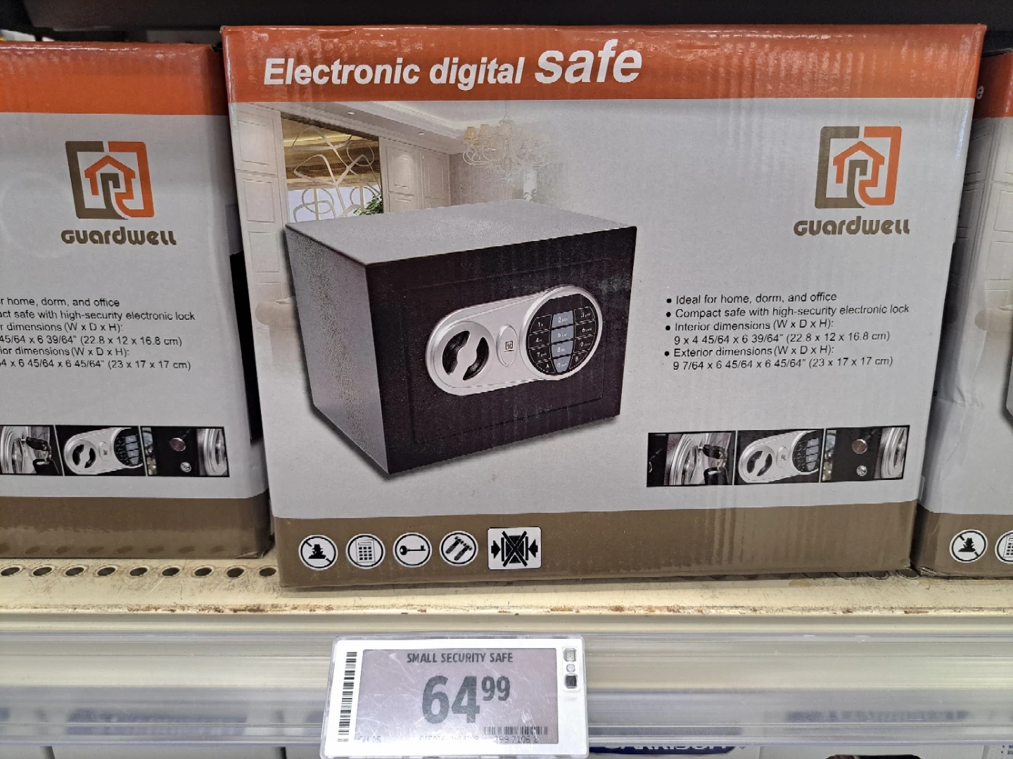 This Guardwell electronic digital safe is ideal for home, dorm, or office use. It's compact and features a high-security electronic lock. Interior dimensions are 9 x 4 45/64 x 6 39/64 inches (22.8 x 12 x 16.8 cm).