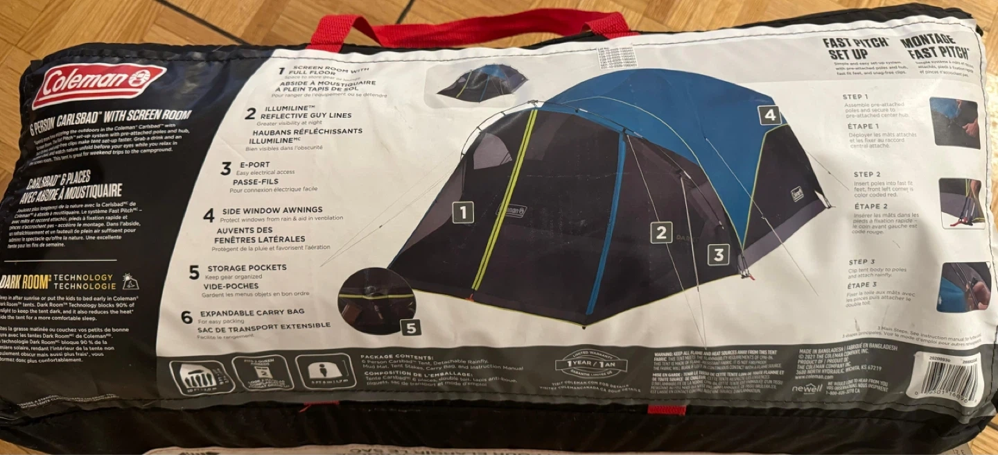 This Coleman Carlsbad 6 person tent offers fast pitch set up and reflective guy lines for enhanced visibility. It features a screen room for extra space and side window awnings. Includes expandable carry bag for easy storage.Coleman 6-Person Camping Tent (DarkRoom + Screen Room)