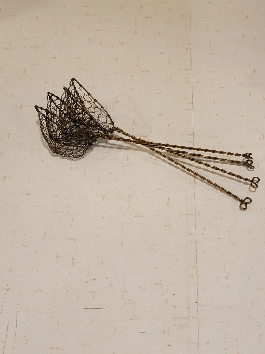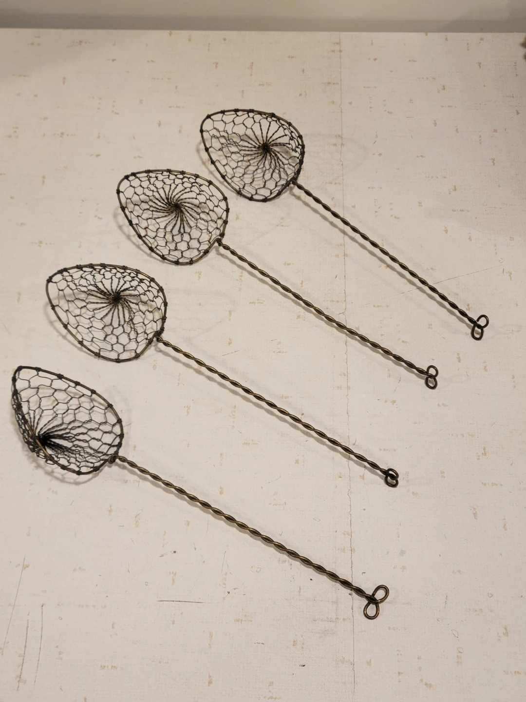 These items are set of four vintage-style wire mesh skimmers or strainers, often used for fondue, hot pot, or skimming fried foods.