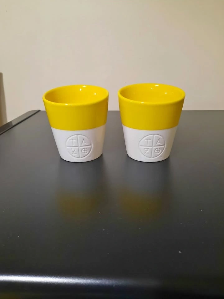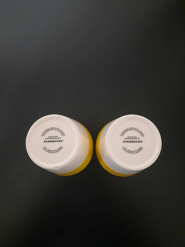 Selling a pair of Starbucks TAZO coffee/tea mugs, yellow and white, from 2012.