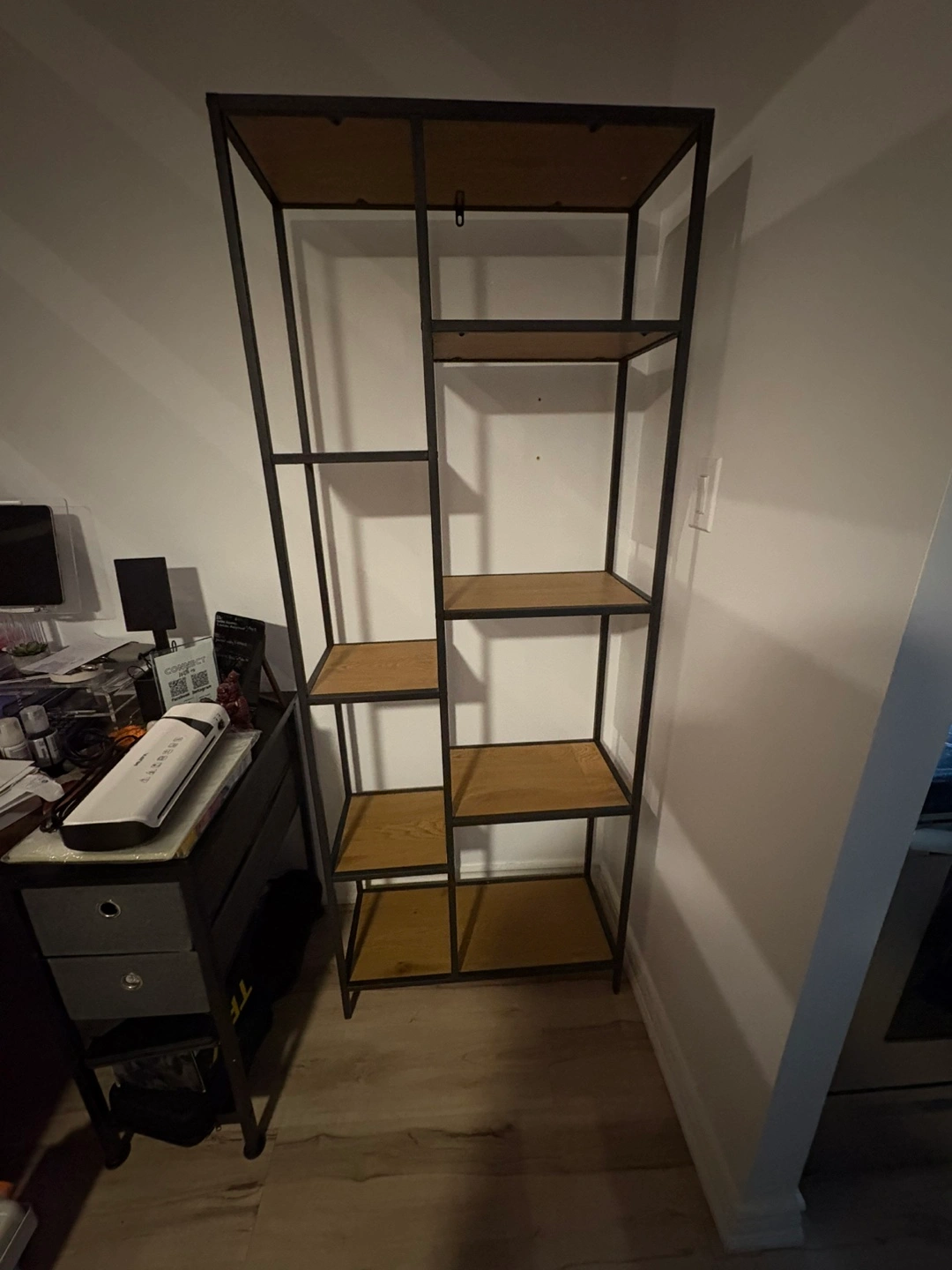Tall, open shelving unit. Black metal frame. Light brown wood shelves. Multiple compartments. Great for books, decor, or storage.