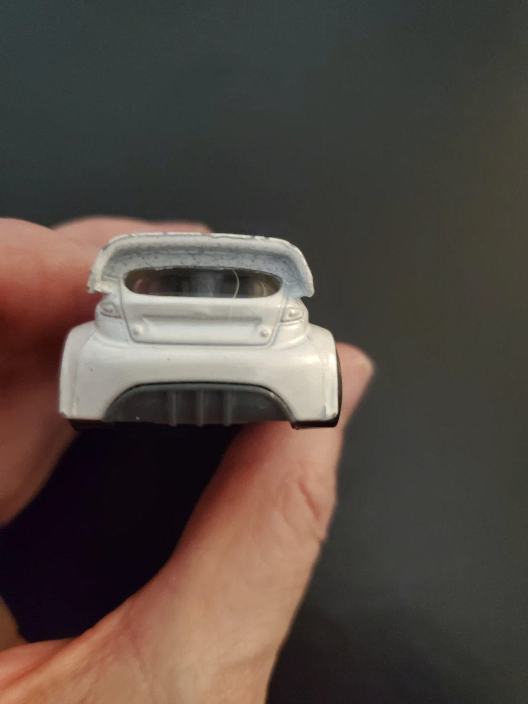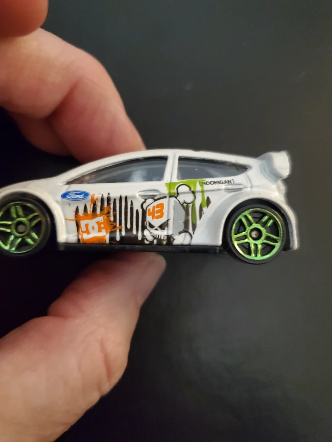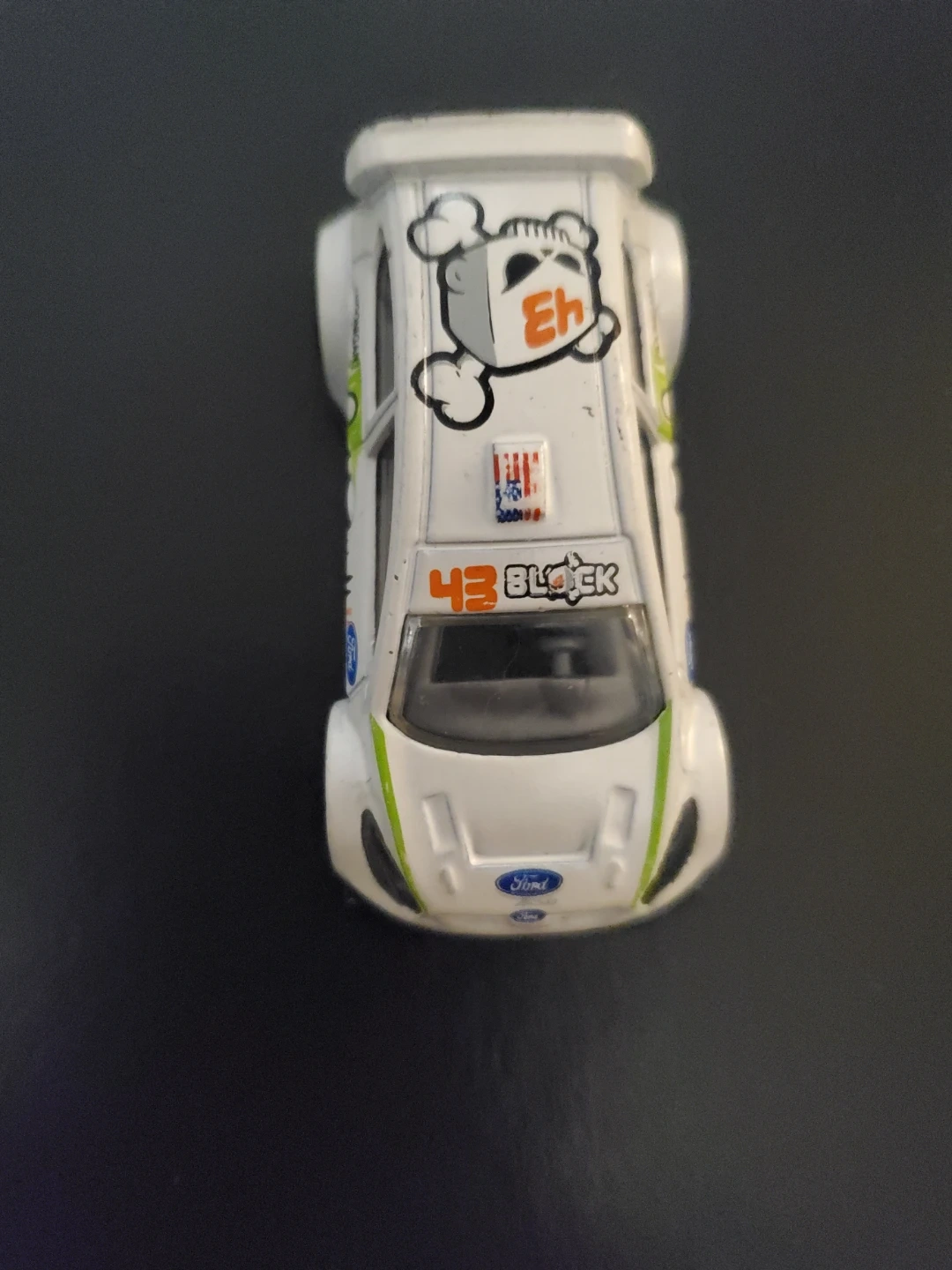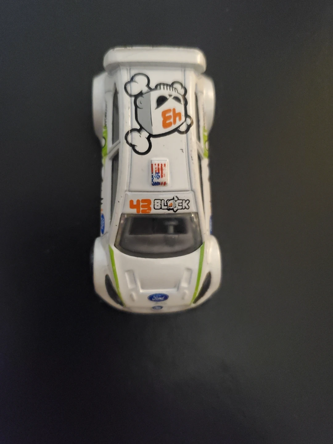 This is a Hot Wheels 2011 Ford Fiesta Ken Block car. It's white with green and orange racing decals. Made in Malaysia. Cedar pick up only.