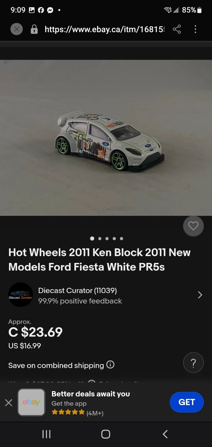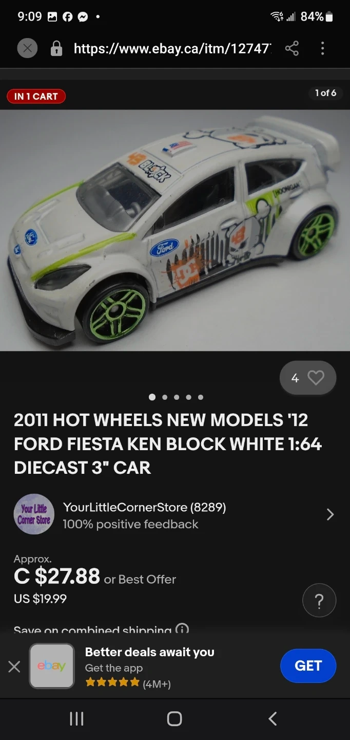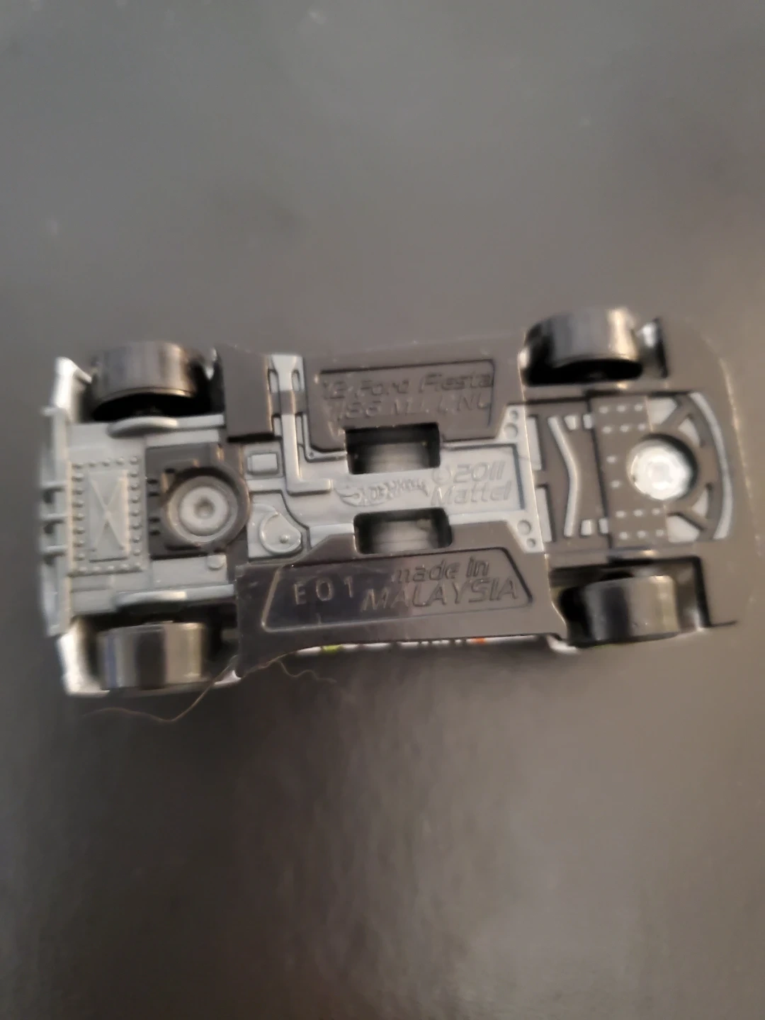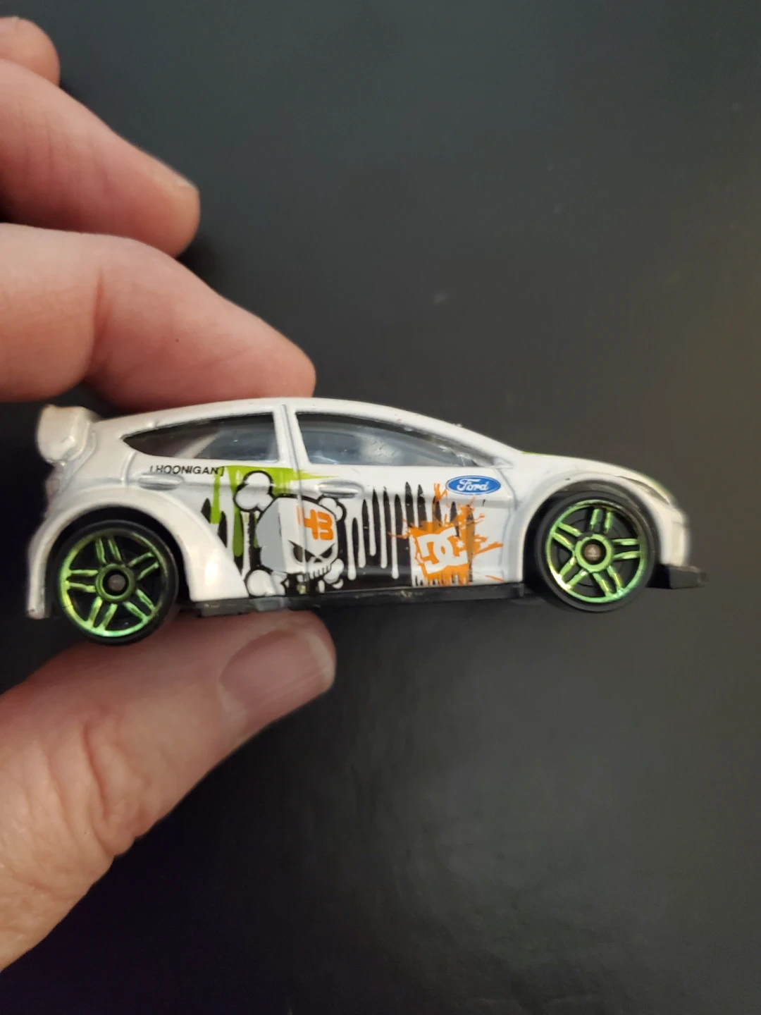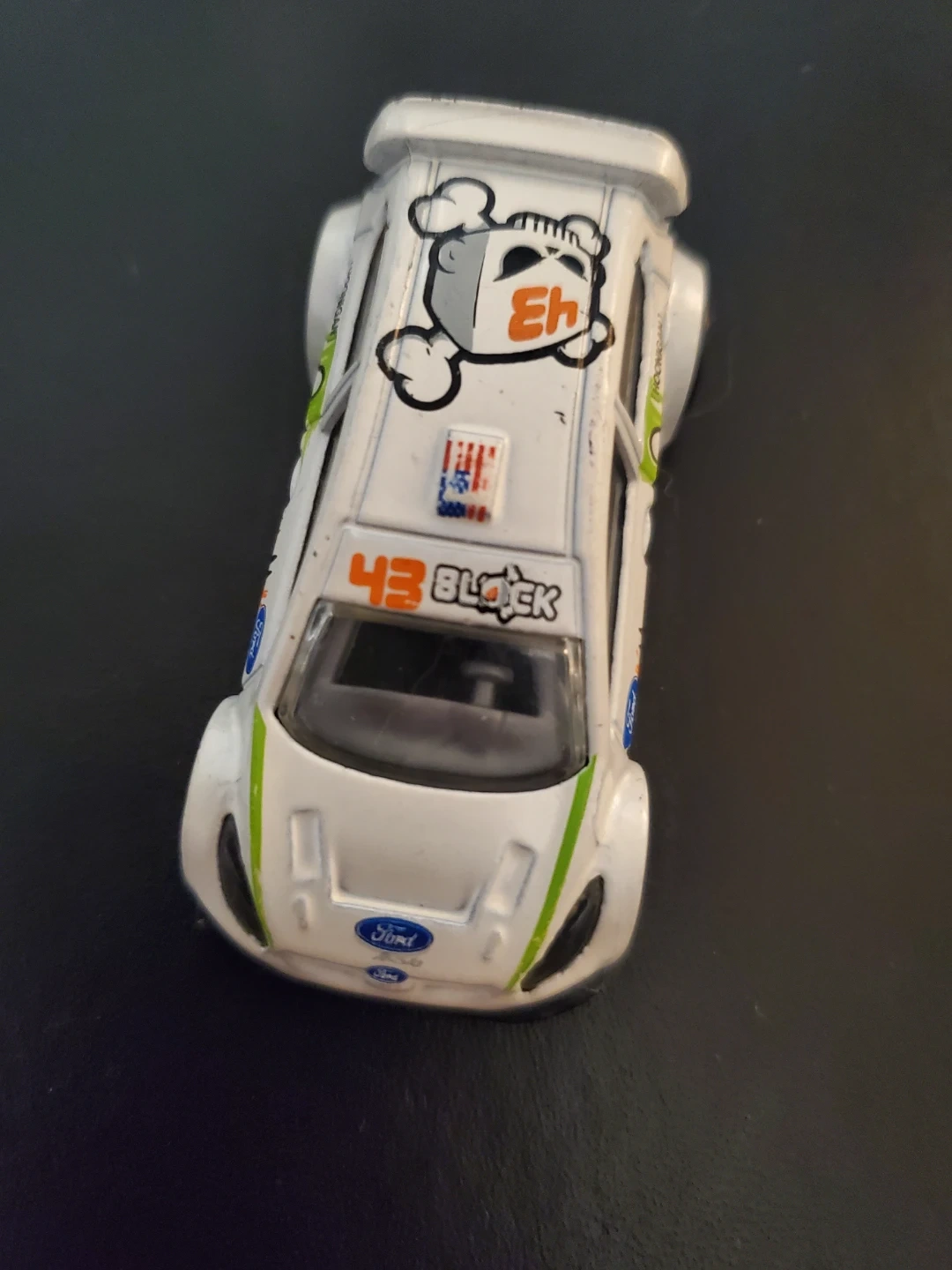 This is a Hot Wheels 2011 Ford Fiesta Ken Block car. It's white with green and orange racing decals. Made in Malaysia. Cedar pick up only.