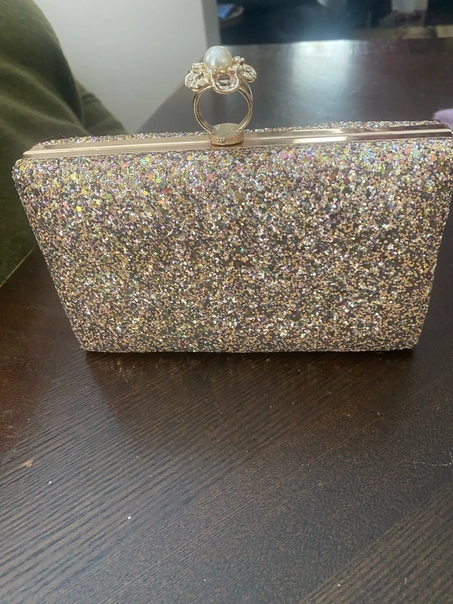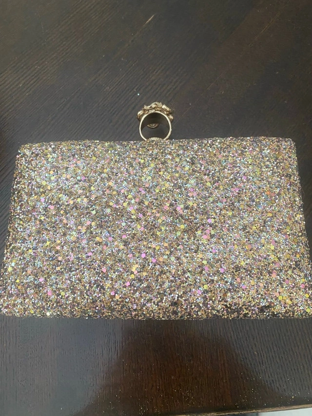 This is a stunning, glittery rose gold clutch, perfect for adding some sparkle to your evening ensemble! It's in excellent condition and ready to dazzle at your next special event. Cash accepted.
