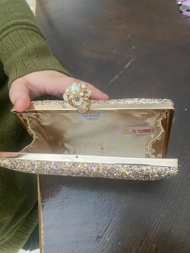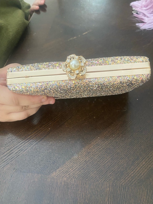 This is a stunning, glittery rose gold clutch, perfect for adding some sparkle to your evening ensemble! It's in excellent condition and ready to dazzle at your next special event. Cash accepted.
