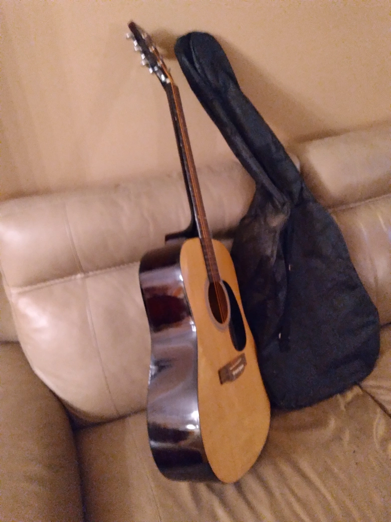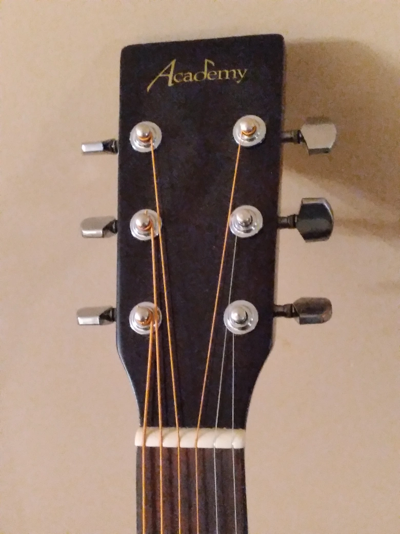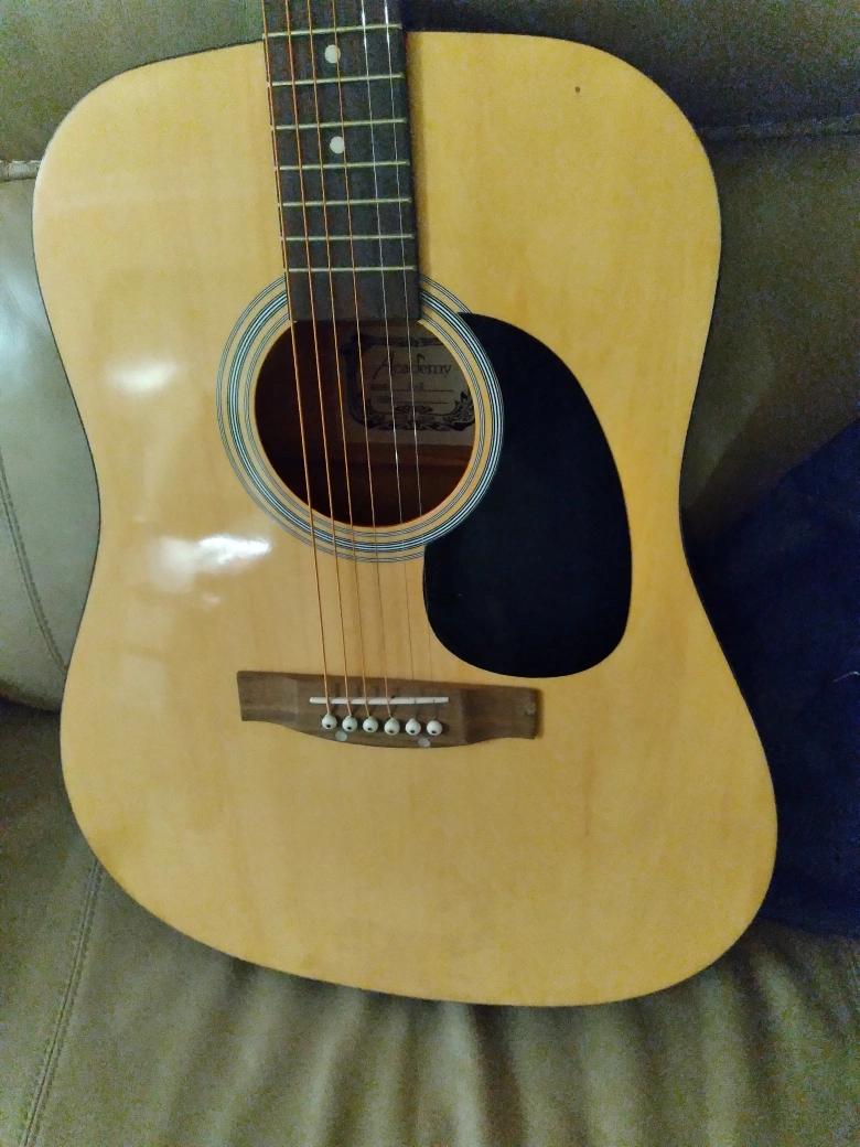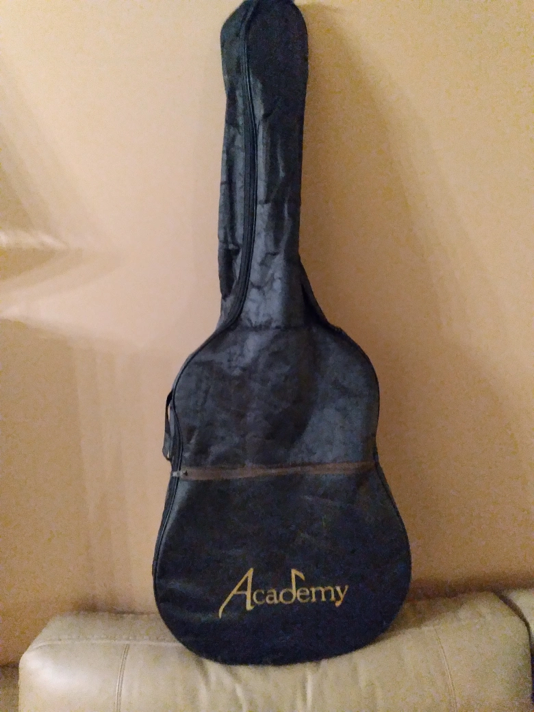 Academy brand hollow guitar with soft bag. Beginners level. Good for students. 24 1/2" scale. Body 4", 16" and 20" long. 41" overall length. Sparingly used and stored with care. No dents or scratches. Good as new. Fitted with complete set of strings. No delivery. only cash payment accepted at sale.