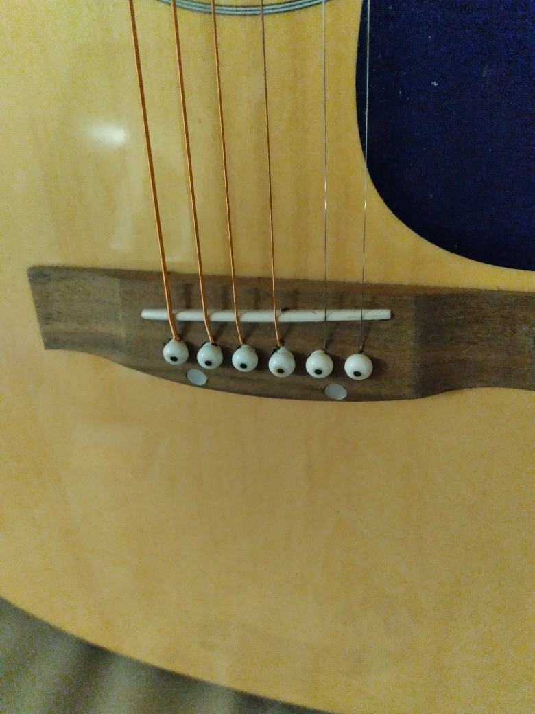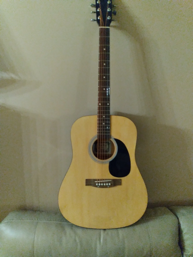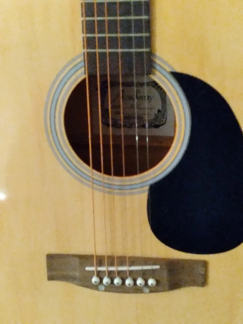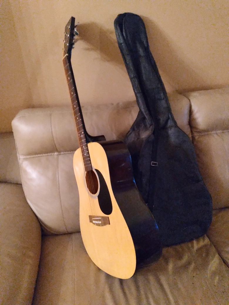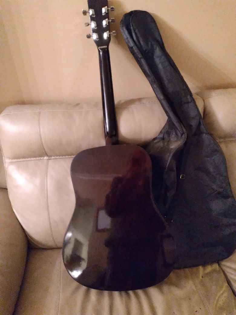 Academy brand hollow guitar with soft bag. Beginners level. Good for students. 24 1/2" scale. Body 4", 16" and 20" long. 41" overall length. Sparingly used and stored with care. No dents or scratches. Good as new. Fitted with complete set of strings. No delivery. only cash payment accepted at sale.