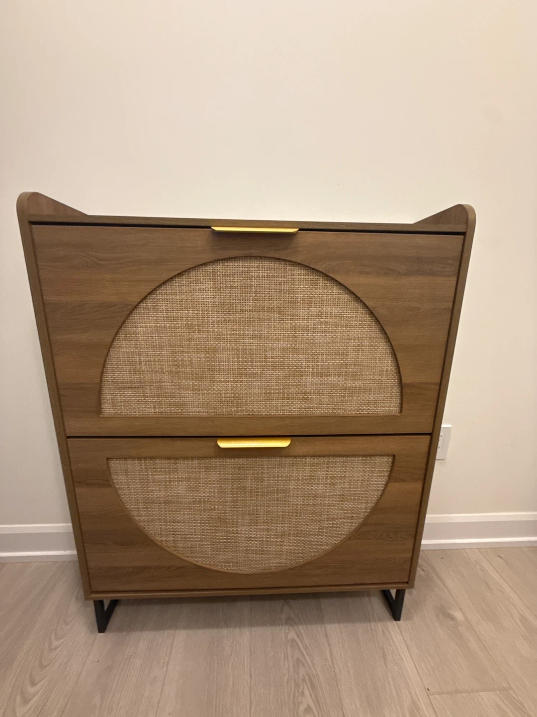 Rattan Shoe Storage Cabinet with two-drawer wooden sideboard featuring woven cane-style doors and modern gold pull handles. It's designed with a tapered silhouette and sits on slim black legs. This piece adds a touch of retro charm to any room.