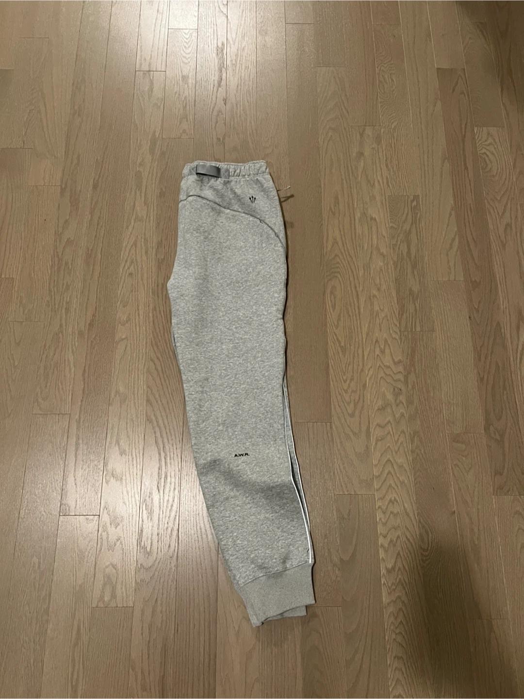 Selling a pair of Nike x Drake NOCTA track pants in grey. They're in great condition and super comfy! Features the NOCTA branding on the leg and a subtle white stripe down the side. Perfect for lounging or hitting the streets.