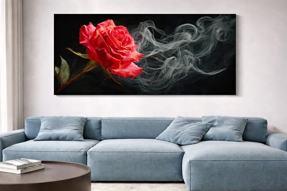 This stunning 52 x 24 inch oversized red rose canvas features dramatic smoke detail on a deep black background, creating a luxury, modern, eye-catching focal point above any sofa or bed. Perfect for contemporary homes, condos, apartments, or office spaces.