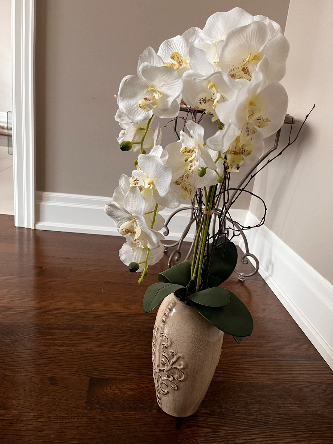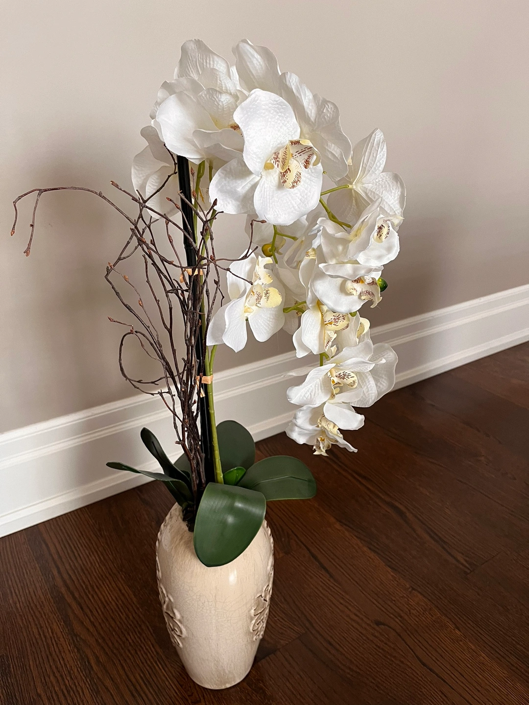 Gorgeous artificial arrangement of white orchids cascading in decorative ceramic vase