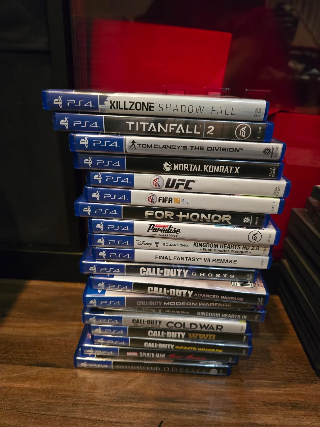Selling a collection of PlayStation 4 video games. Includes titles like Killzone, Titanfall 2, Mortal Kombat X, and various Call of Duty games. Also features Kingdom Hearts and Final Fantasy VII Remake. Great for any PS4 gamer!