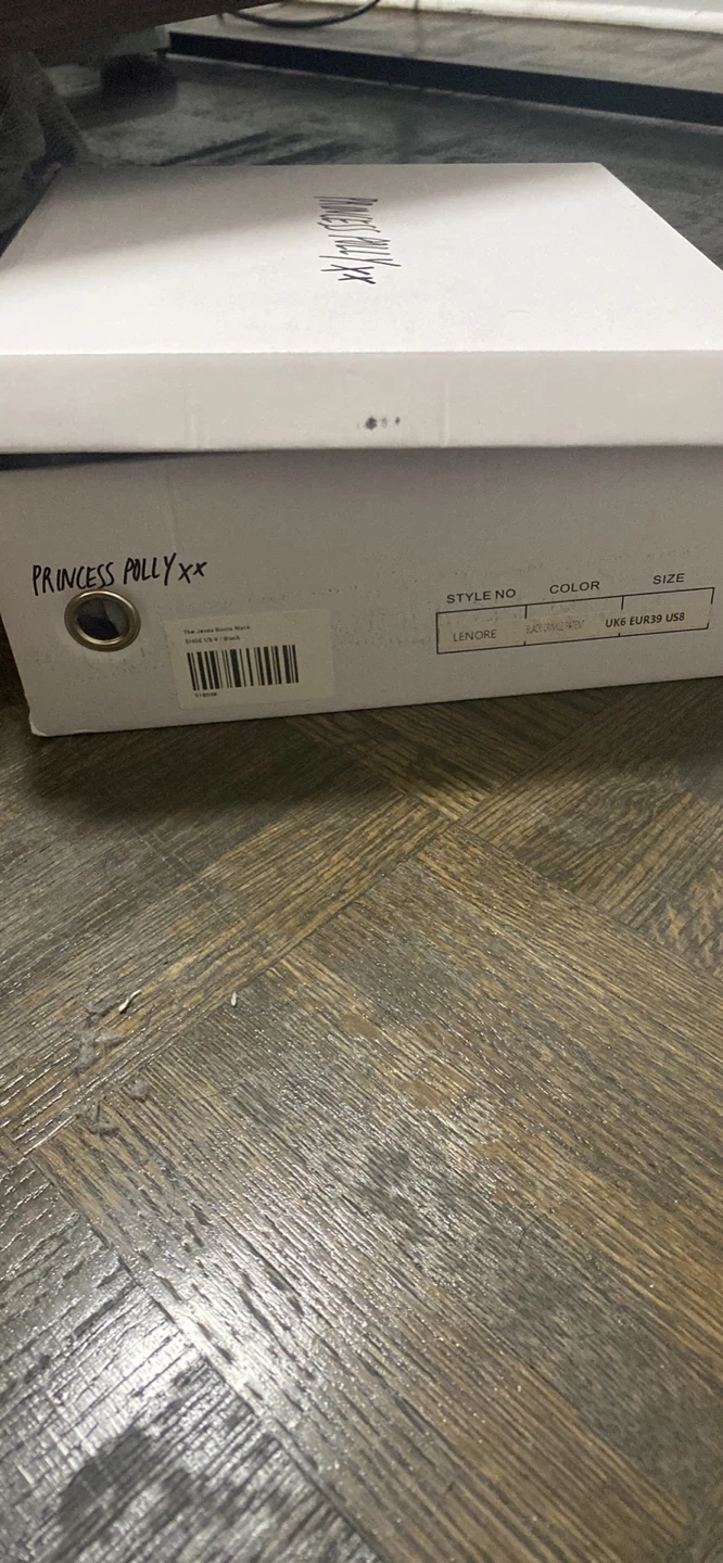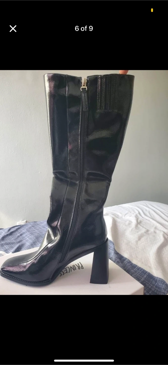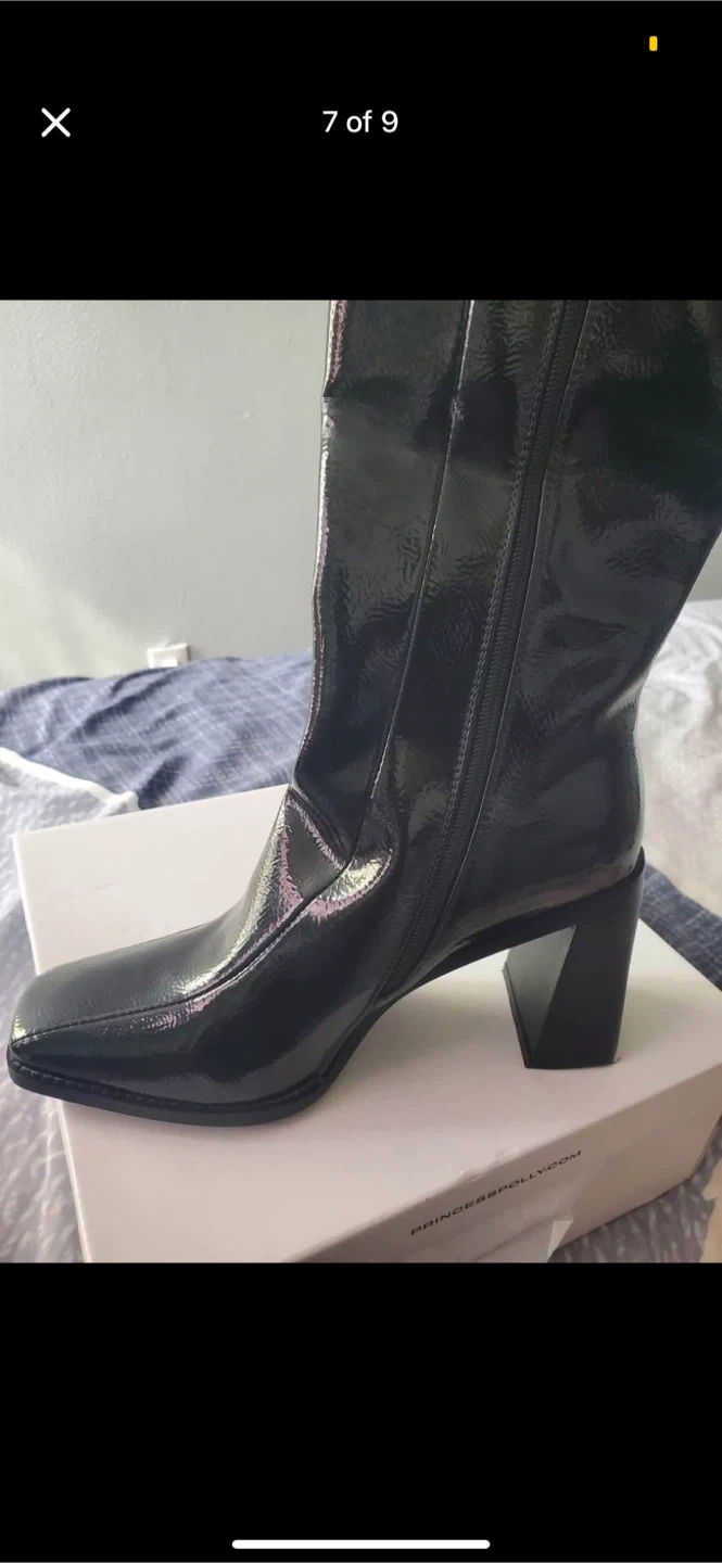 Princess Polly Lenore boots in black crinkle patent! They're a US size 8, EUR 39, and UK 6. Comes with the original box!
