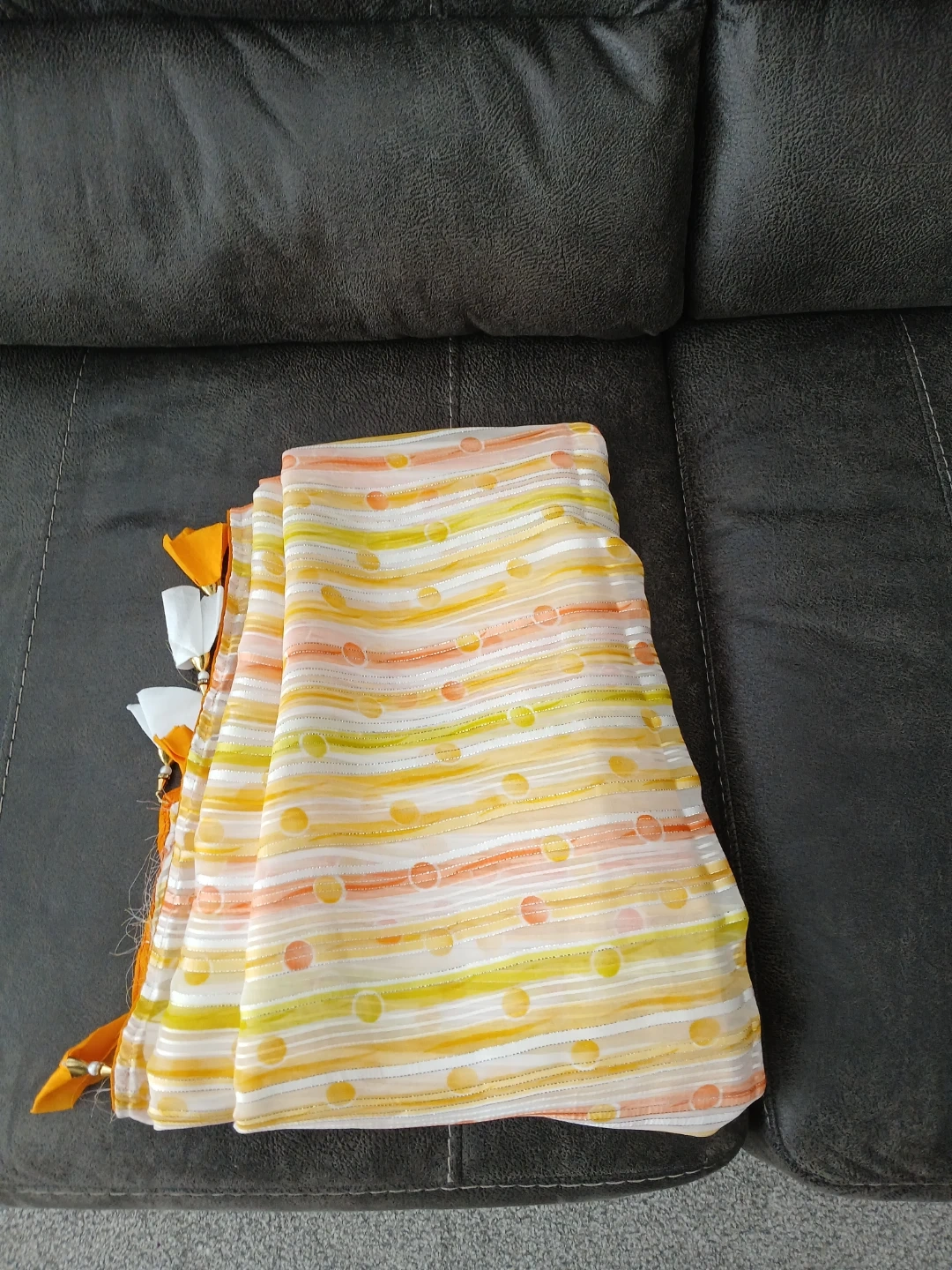 Lightweight Saree featuring a vibrant striped and polka dot pattern. Finished with decorative orange tassels on the ends. Perfect for adding a pop of colour to any outfit!