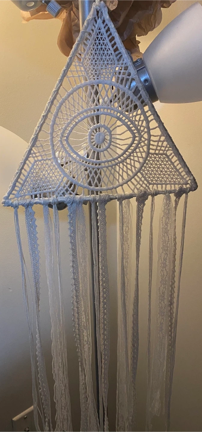 This unique wall hanging features a white lace triangle design with an eye motif. It's adorned with various lace ribbons and strings that hang down. It's a delicate piece for adding a boho touch to your decor!