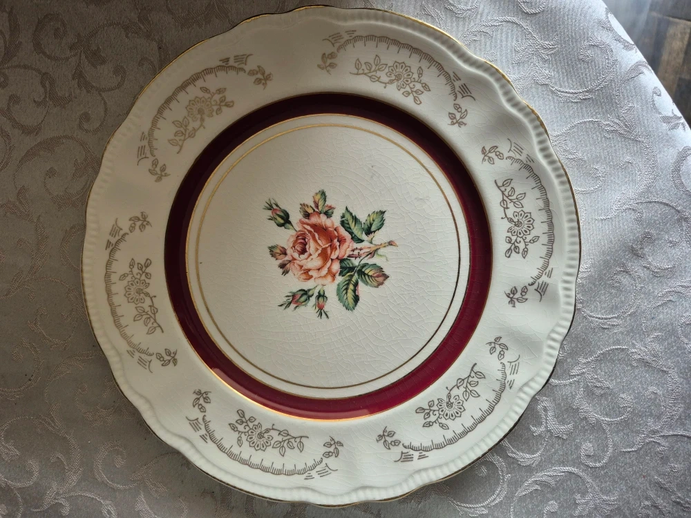 Selling a lovely vintage plate from Radford Pottery. It's made in Canada and features a beautiful floral design with a maroon and gold trim. Perfect for adding a touch of vintage charm to your home!