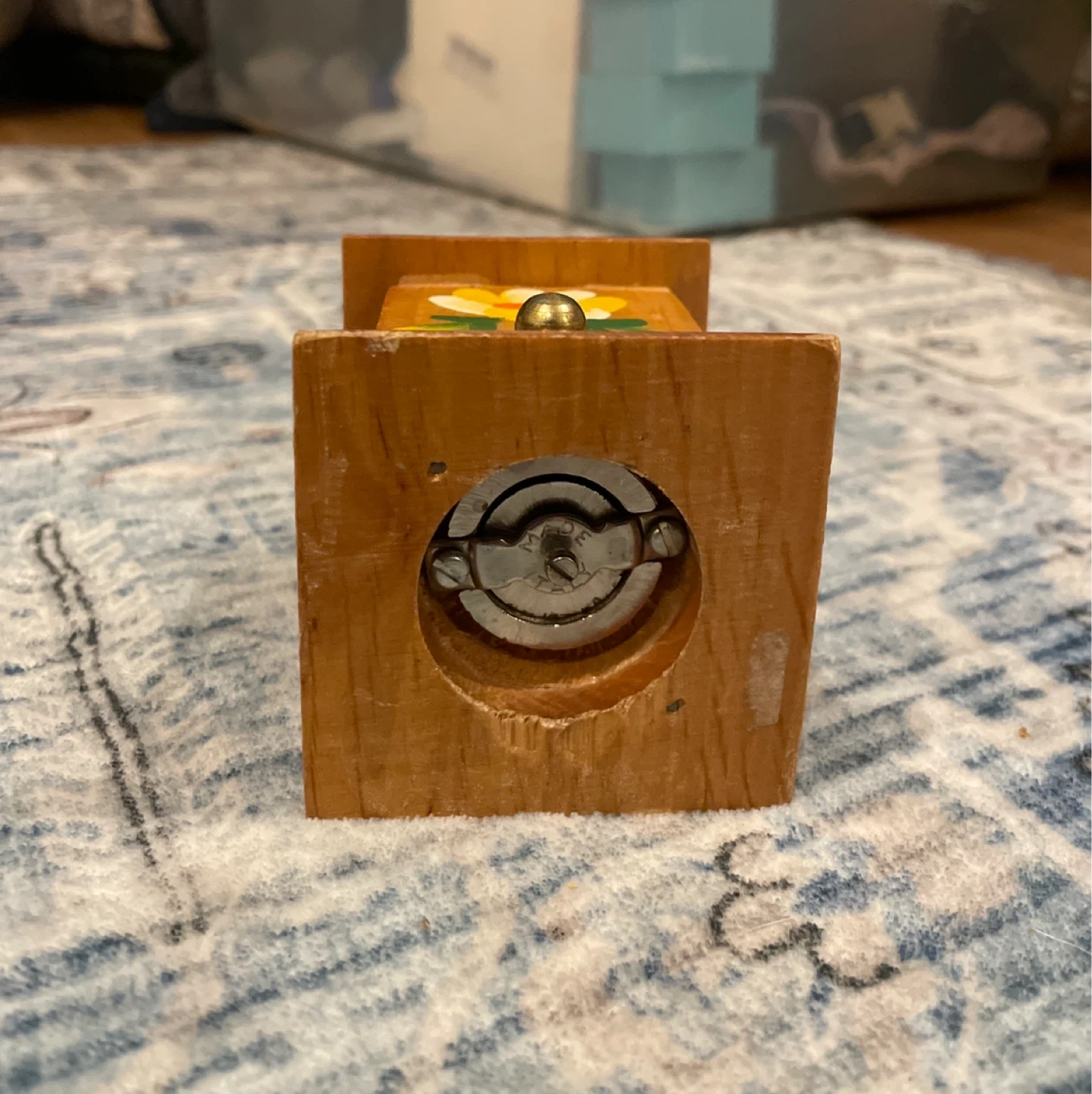 Selling a vintage Roccaspinalveti Salt grinder! It's a charming piece with a wooden base and a brass-coloured top. The grinder has a lovely floral design painted on the front. Perfect for adding a touch of nostalgia to your kitchen, in working condition