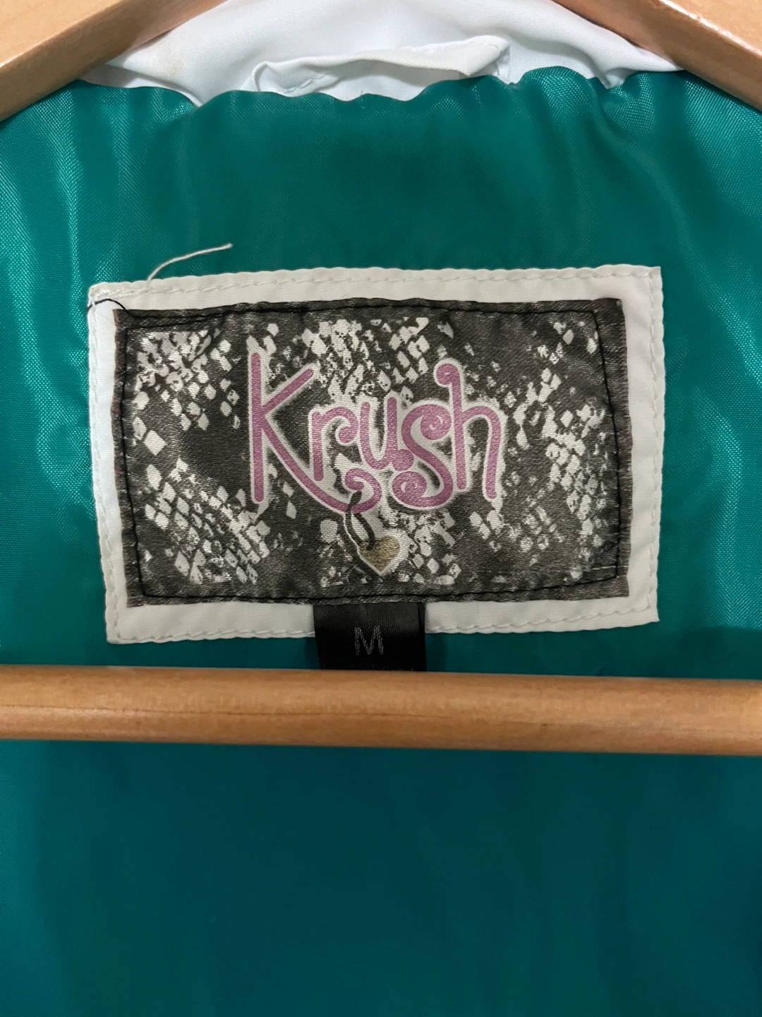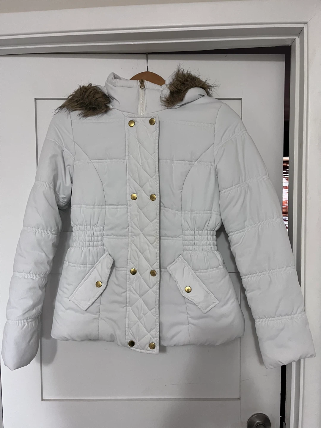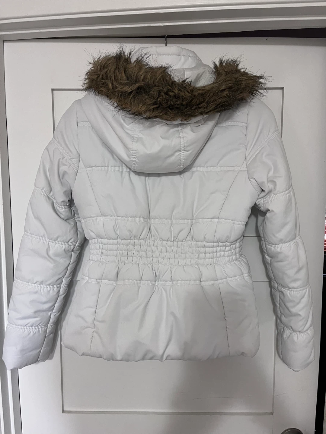 Krush ladies winter jacket in white with faux fur trim on the hood. It says size medium but it will fit a small. It’s in good condition and very clean.