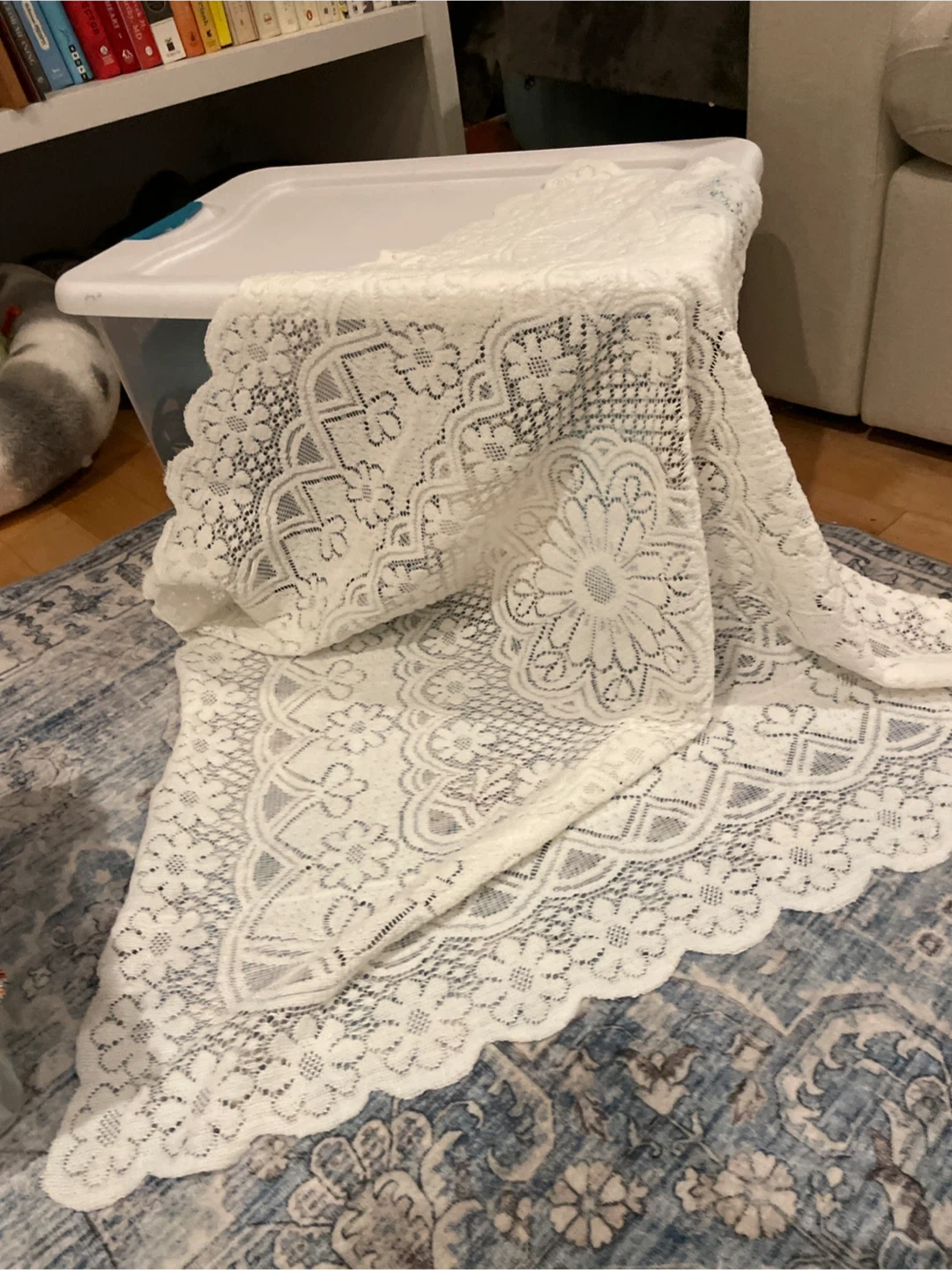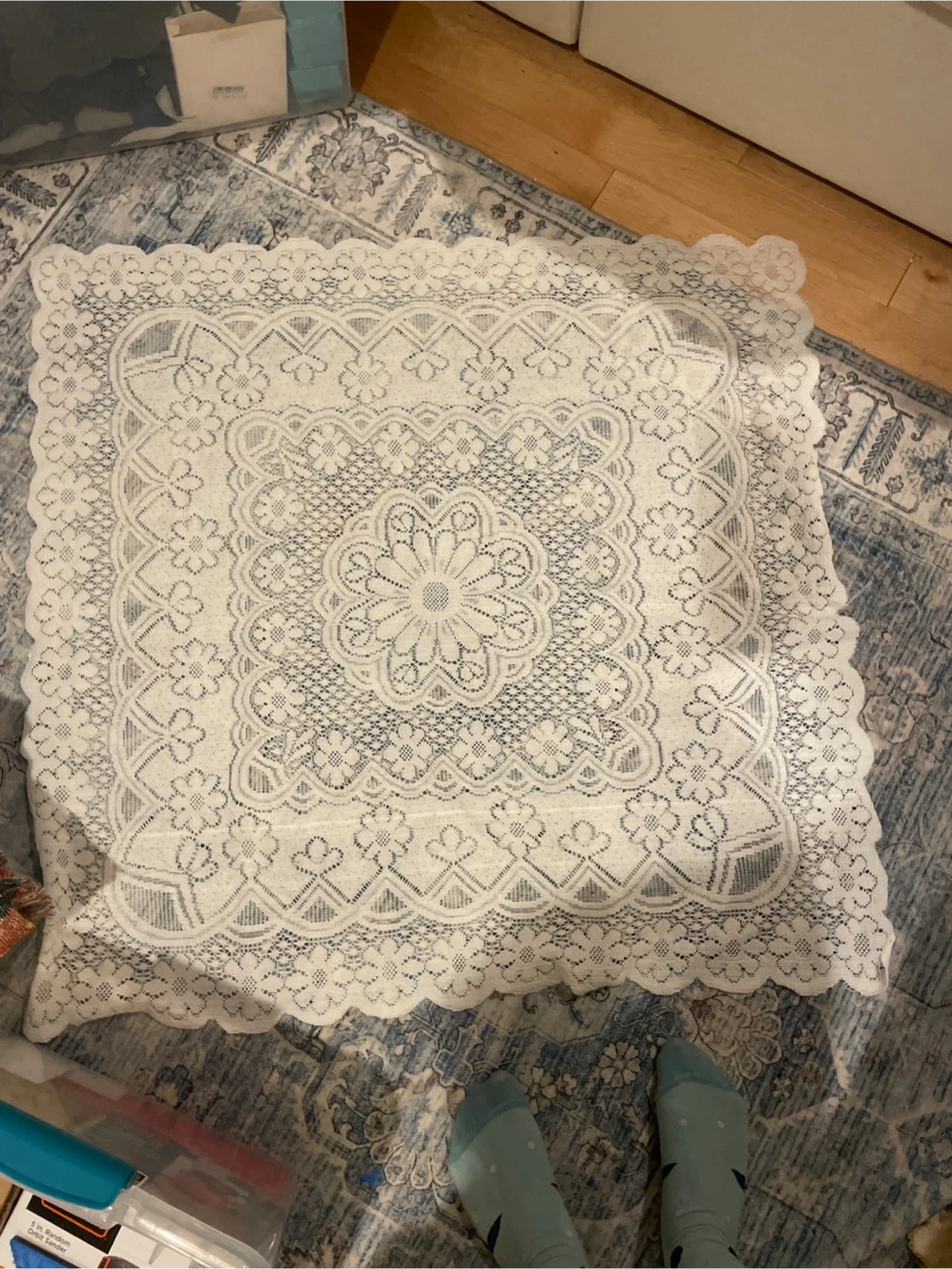 Selling a pretty white lace tablecloth. It's in great condition and would look lovely on a small table or as a decorative accent. The intricate floral pattern adds a touch of elegance to any space!