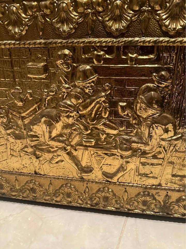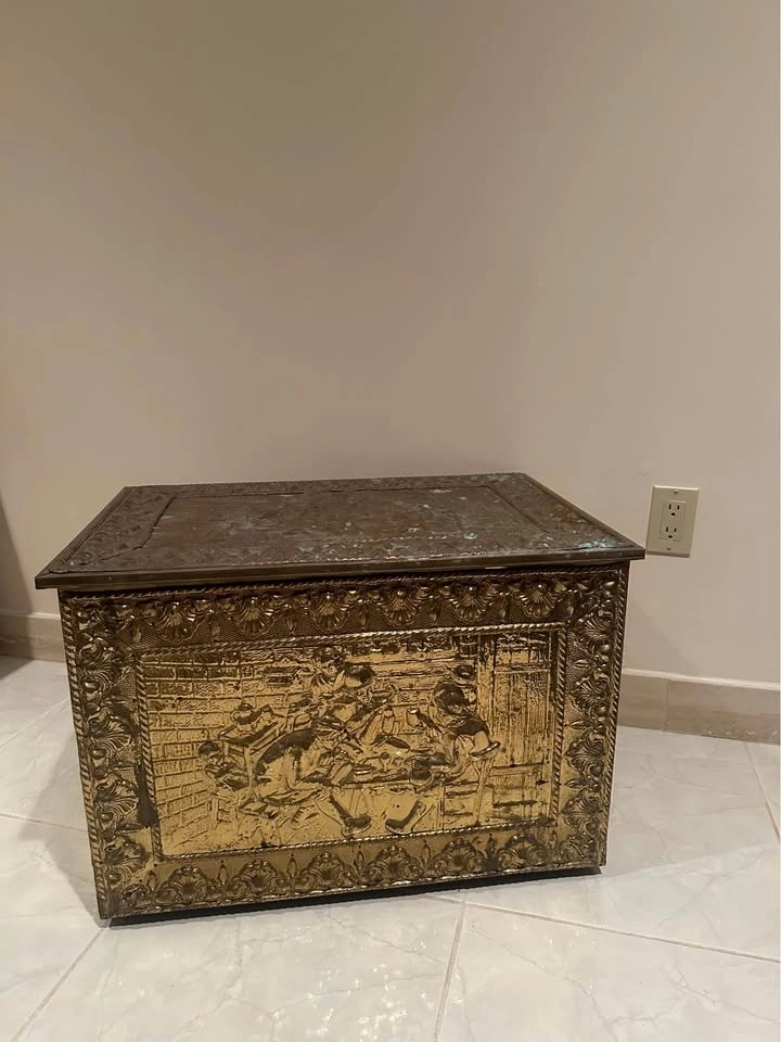 This is an embossed brass log or coal box, often used as a fireside storage chest. The brass exterior is decorated with embossed historical tavern scene.