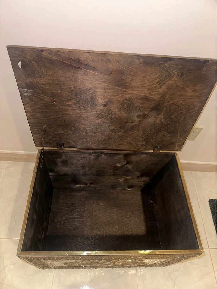 Gorgeous embossed repousse brass and copper over solid wood chest, the brass covers the front and both sides with the backside being ebonized wood.